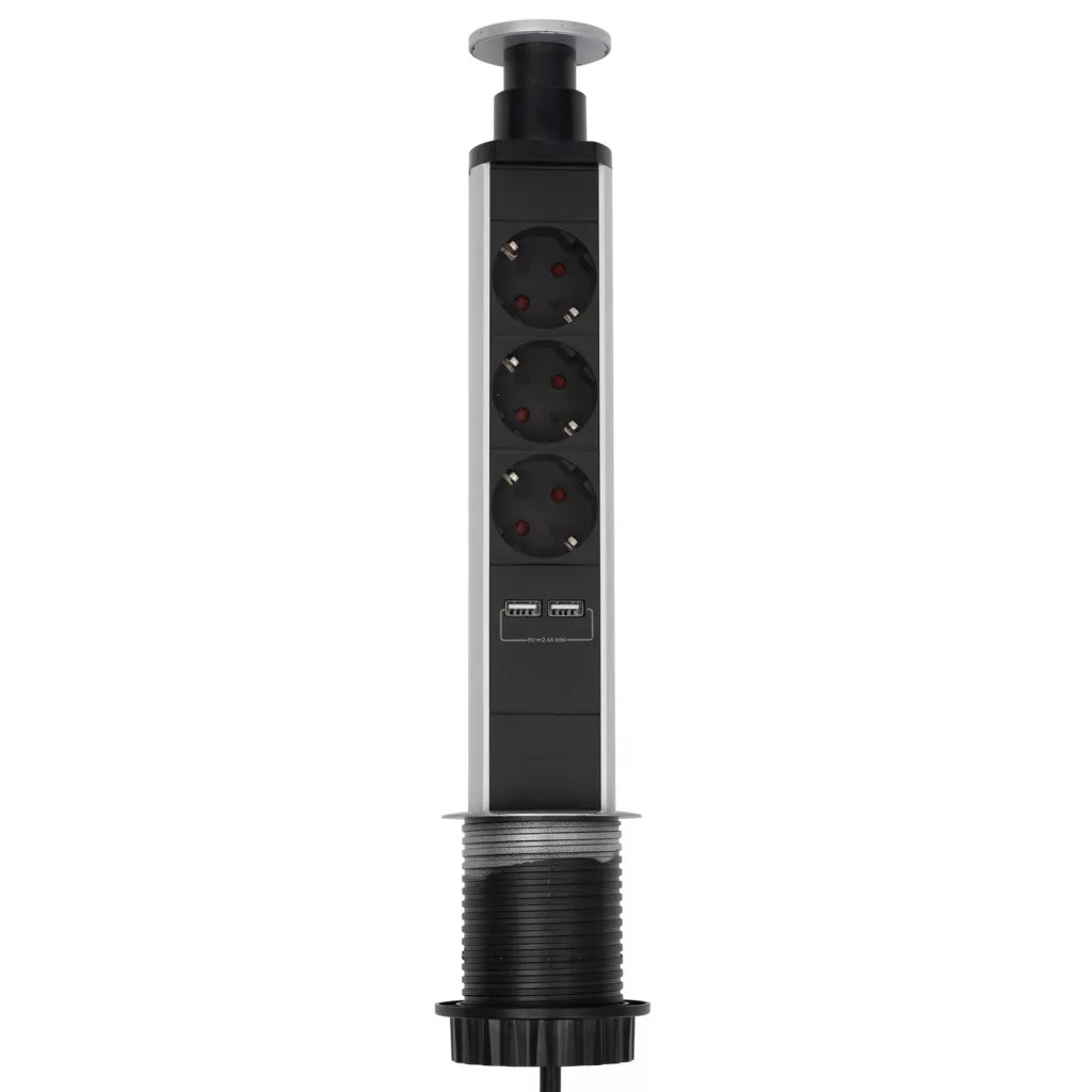 Home NVE 3/USB süllyesztett elosztó USB töltőaljzatokkal, 1,4 m, 3 földelt aljzat gyermekvédelemmel, asztalba, munkalapba építhető, süllyeszthető, max. 3680 W