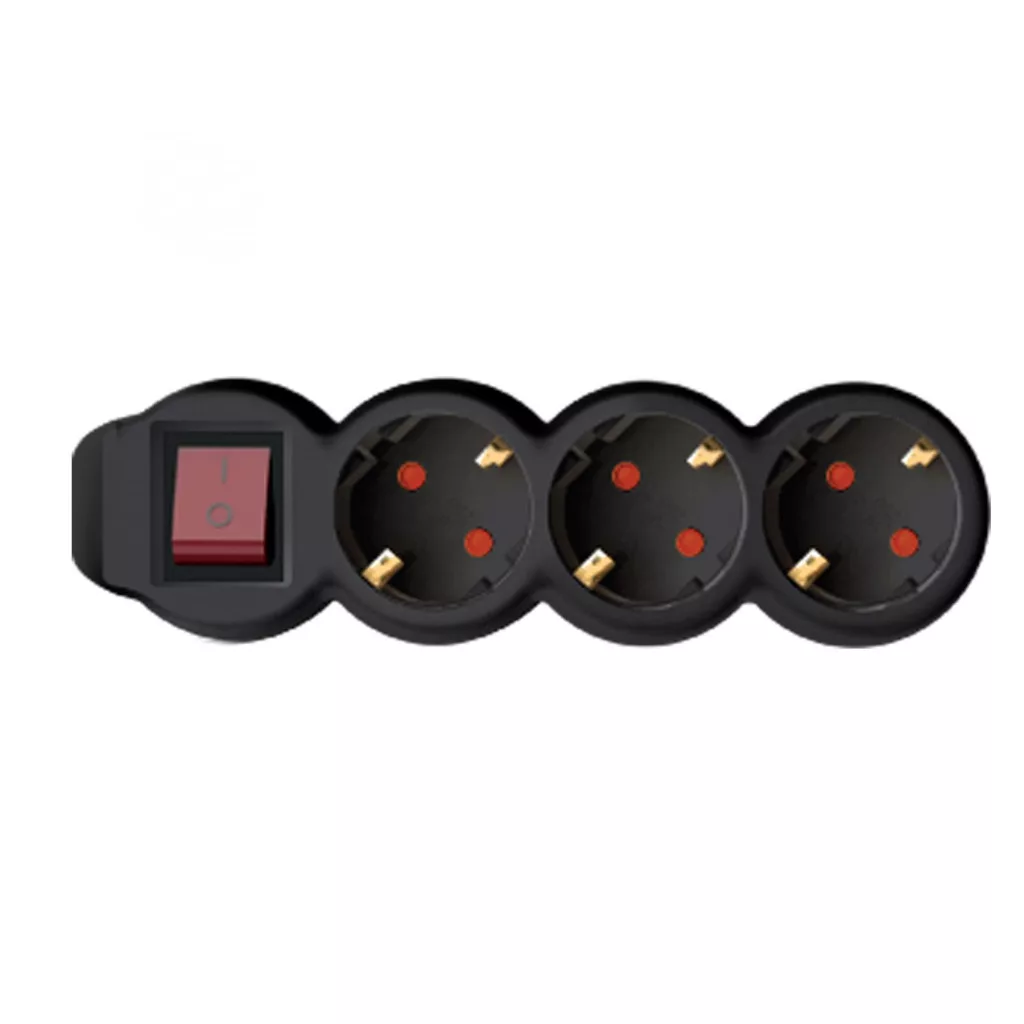 Az NV 3K-3/BK/1,5 Kapcsolós hálózati elosztó 3 db aljzattal ellátott, melyet egy fő kapcsolóval áramtalanítani tud. A biztonságos használat érdekében IP 20 védelemmel és gyermekvédelemmel ellátott. A fekete színű elosztó 3 m hosszú H05VV-F 3G1,5 mm2 kábellel felszerelt. Maximum 3500 W-ig terhelhető.