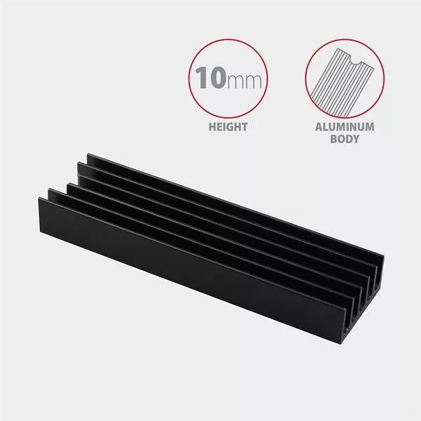 AXAGON CLR-M2L10 ALU passzív hűtőborda ideális a nagy teljesítményű M.2 SSD-k, különösen az NVMe hűtéséhez.