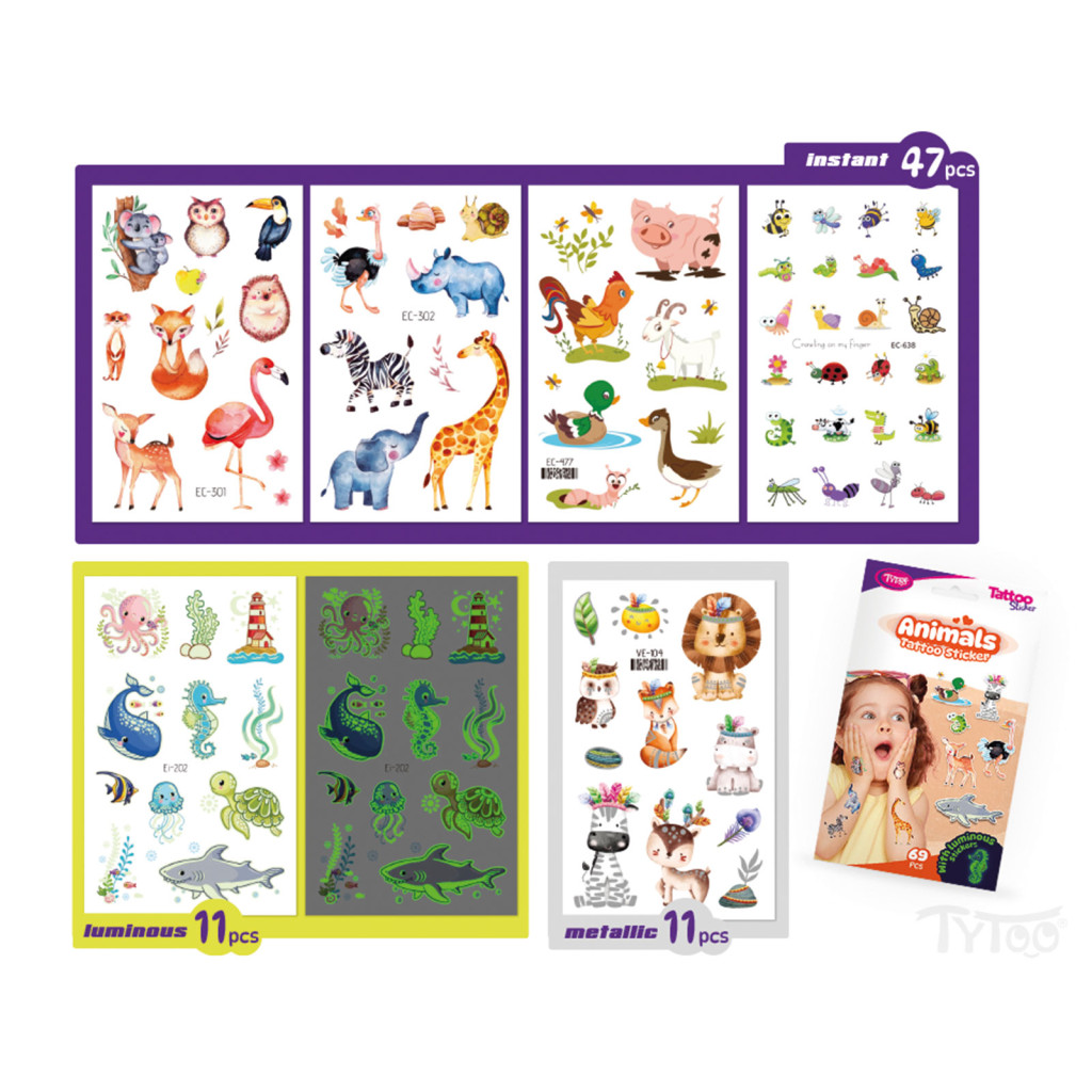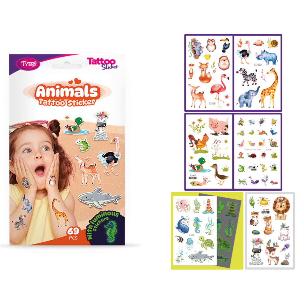 Minden ami állatkás! Könnyen felvihető, egyszerű és látványos tetkók, állatos mintákkal, szettben. Igazi állat imádó gyerekeknek. Ezek az ideiglenes tetoválás matricák kiváló minőségűek, így hosszabb ideig, napokig is megőrzik élénk színüket és részletgazdagságukat. Könnyen felhelyezhetőek és eltávolíthatóak, anélkül hogy irritálnák vagy károsítanák a bőrt. 69 db Állatos matrica tetoválás 6 db íven: Nagy állatok, kis állatok, világítós állatok, vizi állatok és minden, ami állat.