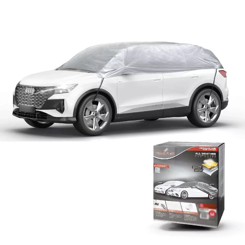 Strapabíró, 120 g/m²-es PEVA-bevonatú, nem szőtt anyagból készült, ami vízállóvá teszi – ez nagy előny kültéri használatra. Ez megvédi járművét esőtől, jégtől, hótól és egyéb szennyeződésektől, például portól, madárürüléktől és levelektől. A burkolat beltérben is használható, ha autóját hosszabb ideig nem használja. Javasoljuk, hogy legalább kéthetente szellőztesse ki, hogy elkerülje a páralecsapódást és a penészesedést!