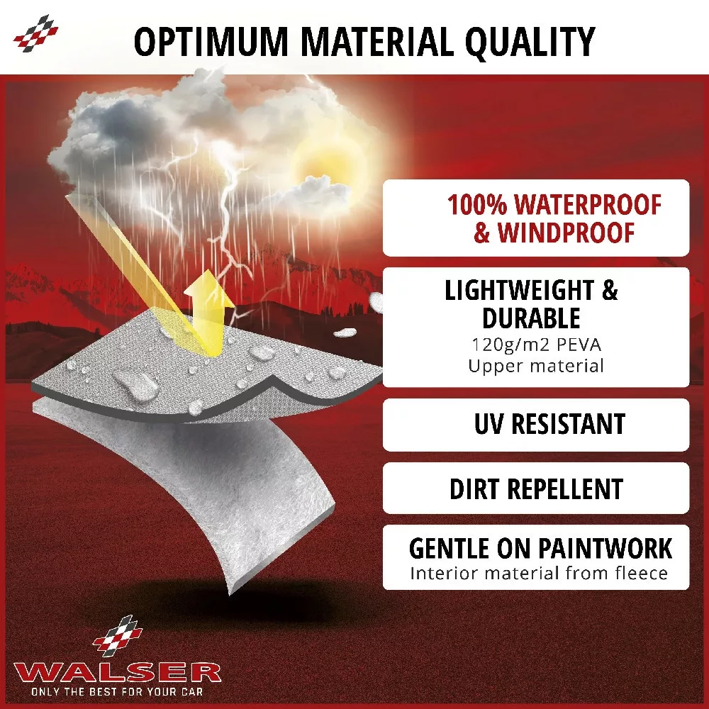 Ha nincs garázsa és minden időjárási körülmény között a szabadban kell parkolnia, az gyorsan csúnya és koszos lehet. Ennek lehető legnagyobb mértékű megelőzése és a fényezés védelme érdekében az Ön számára megfelelő terméket kínáljuk. Tökéletes védelmet nyújt a szennyeződések és az időjárás viszontagságai ellen, így járműve mindig kiváló állapotban marad. Bízzon a WALSER bevált minőségében és óvja autóját!