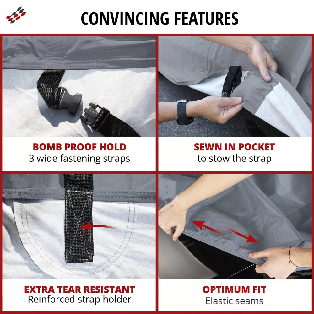 Annak érdekében, hogy bármikor ráhúzhassa autójára, az összeszerelés nagyon egyszerű. Elöl és hátul gumiszalag van bevarrva, ami megkönnyíti a ponyva felszerelését. Ezen kívül három széles rögzítőpánt található erős pattintható zárakkal, amelyek rögzítik a ponyvát a jármű alatt, és megakadályozzák annak elfújását. A speciálisan megerősített hevederrögzítés még jobb tartósságot biztosít erős szélben. Oldalt egy kis zseb található a kiálló rögzítőpánt számára, hogy ne feküdjön a koszos talajon. A termék csomagolása praktikus tárolótáskaként is szolgál. Kérjük, vegye figyelembe, hogy a burkolat alatt páralecsapódás és nedvesség képződhet, ha hosszú ideig esik erős eső, és a levegő nagyon nedves vagy a talaj nagyon nedves. Erős hőmérséklet-ingadozás esetén a burkolat alatt páralecsapódás is kialakulhat. Ez attól függetlenül megtörténik, hogy a burkolat vízálló-e vagy sem. Ezért még fontosabb, hogy rendszeresen távolítsuk el a ponyvát az autóról, szellőztessük és szárítsuk.