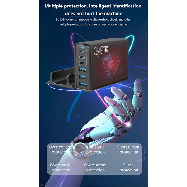 BLACKBIRD Hálózati Töltő GAN 135W 3xUSB-C 20W + 3xUSB 5V, Fekete