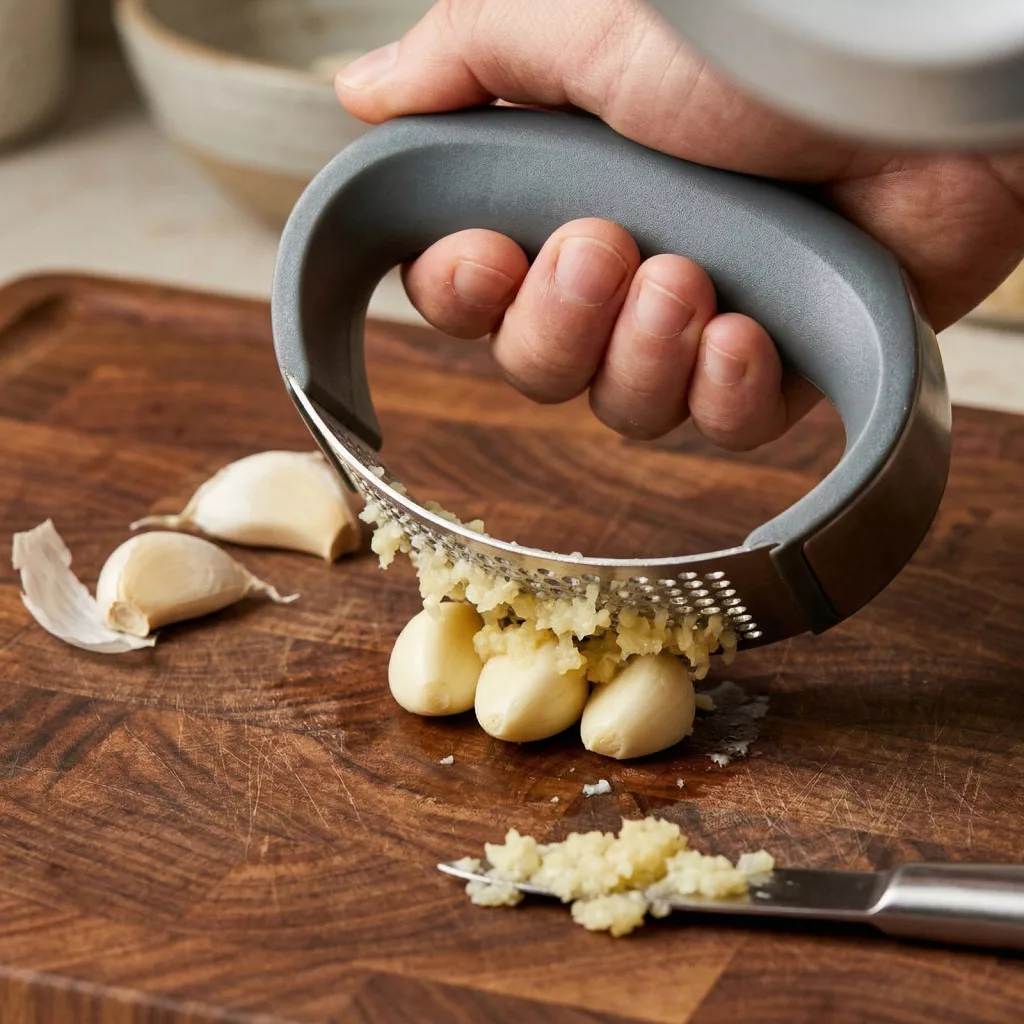 A rozsdamentes acél fokhagymanyomó modern, ívelt kialakításának köszönhetően rendkívül kényelmes és hatékony konyhai eszköz. Használata egyszerű: egy enyhe, hintázó mozdulattal gyorsan és erőfeszítés nélkül pépesíti a fokhagymát, így pillanatok alatt elkészítheti az ízletes ételek alapját. A rozsdamentes acél présfelület tartós és higiénikus, emellett könnyen tisztítható. Ergonomikus markolata biztos fogást ad, így hosszabb előkészítés során sem terheli a kezet.