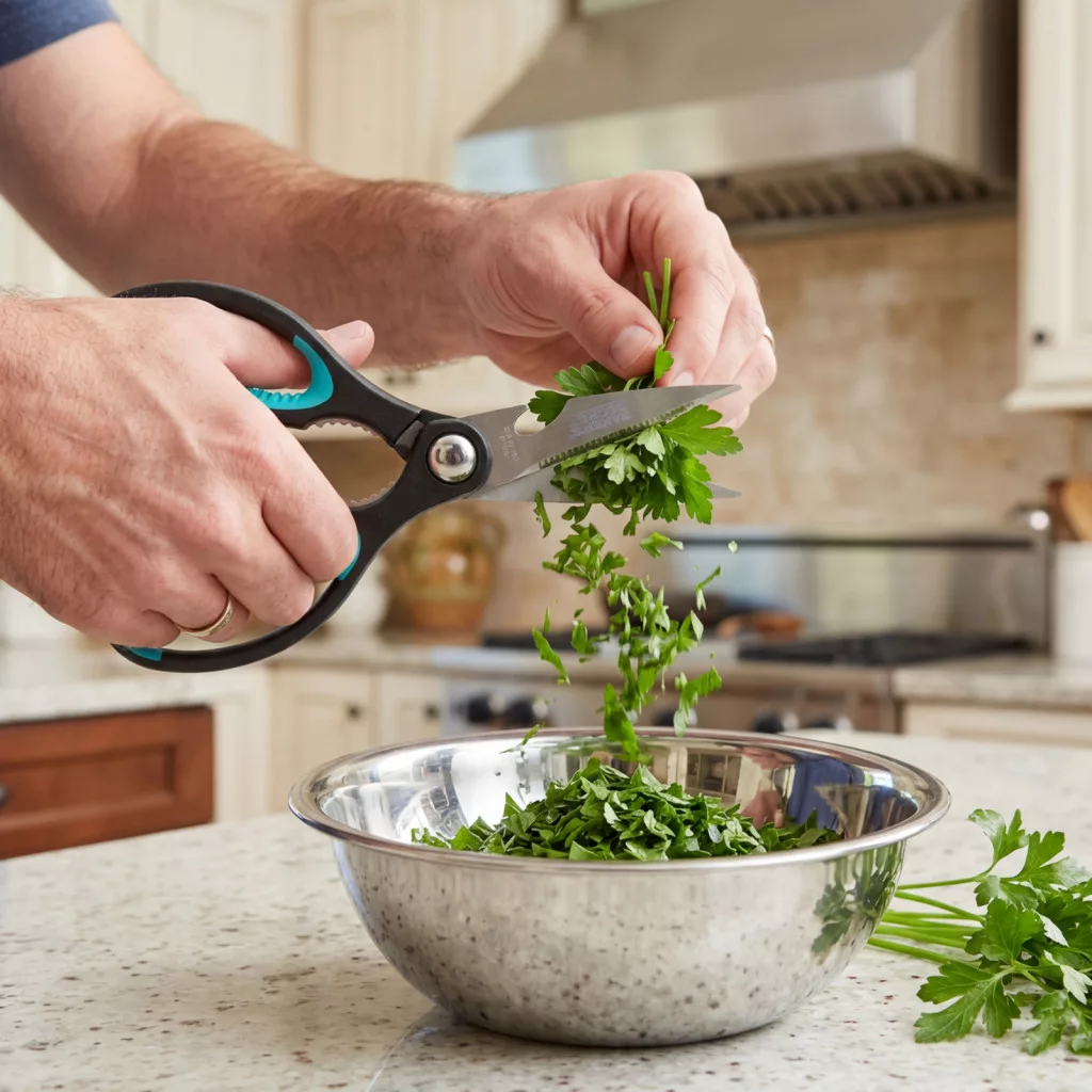Ez a masszív és sokoldalú konyhai olló nélkülözhetetlen eszköz minden háztartásban. A rozsdamentes acélból készült, éles pengék könnyedén megbirkóznak a húsokkal, zöldségekkel, fűszernövényekkel és csomagolóanyagokkal is, így kiváló társ a mindennapi konyhai előkészületek során.