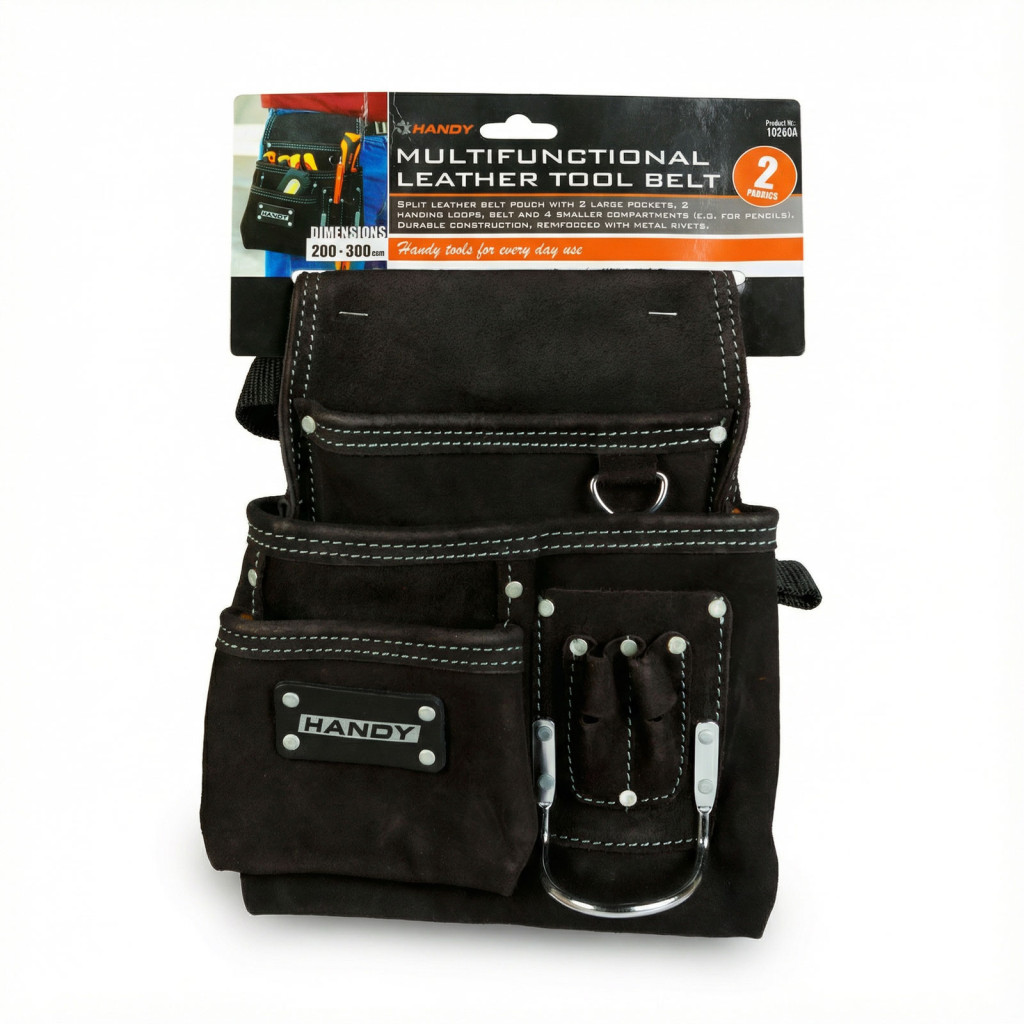 Hasított bőrből készült övtáska 2 nagy zsebbel, 2 akasztóhurokkal, övvel és 4 kisebb tárolóval (pl. ceruzának). Strapabíró kivitel, fém szegecsekkel erősítve.