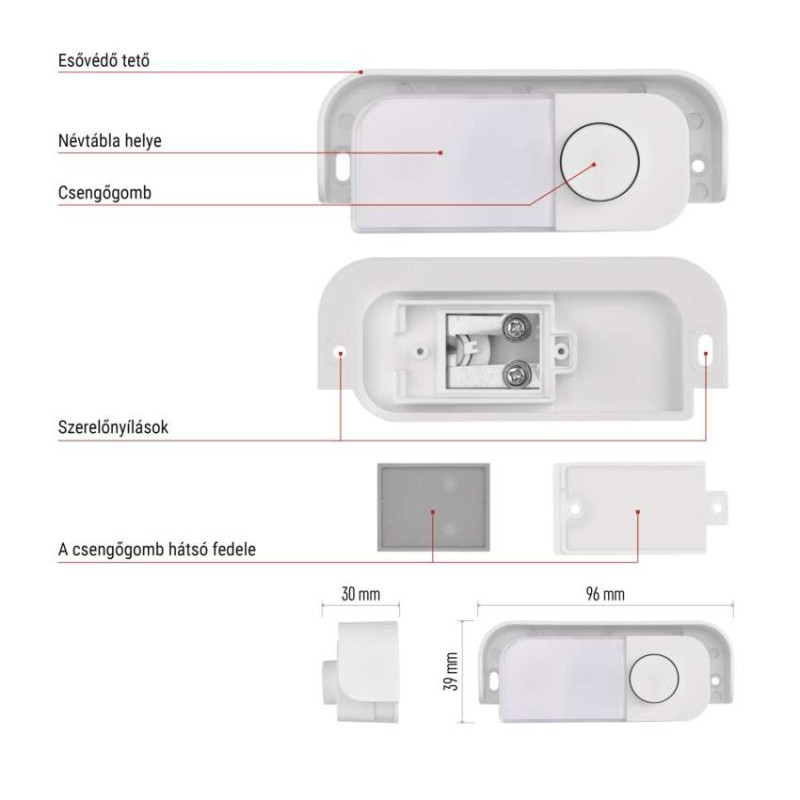 a csengőtípushoz tervezett: P57101, P57102|értékesítési csomagolás: 1 db, kis doboz|hatótávolság szabad területen: –|jelátviteli frekvencia: –|jelátviteli módszer: vezetékes|nyomógomb méretek: 96 × 30 × 39 mm|párosítási módszer: –|táplálás: max. 24 V DC|védettség: IP44