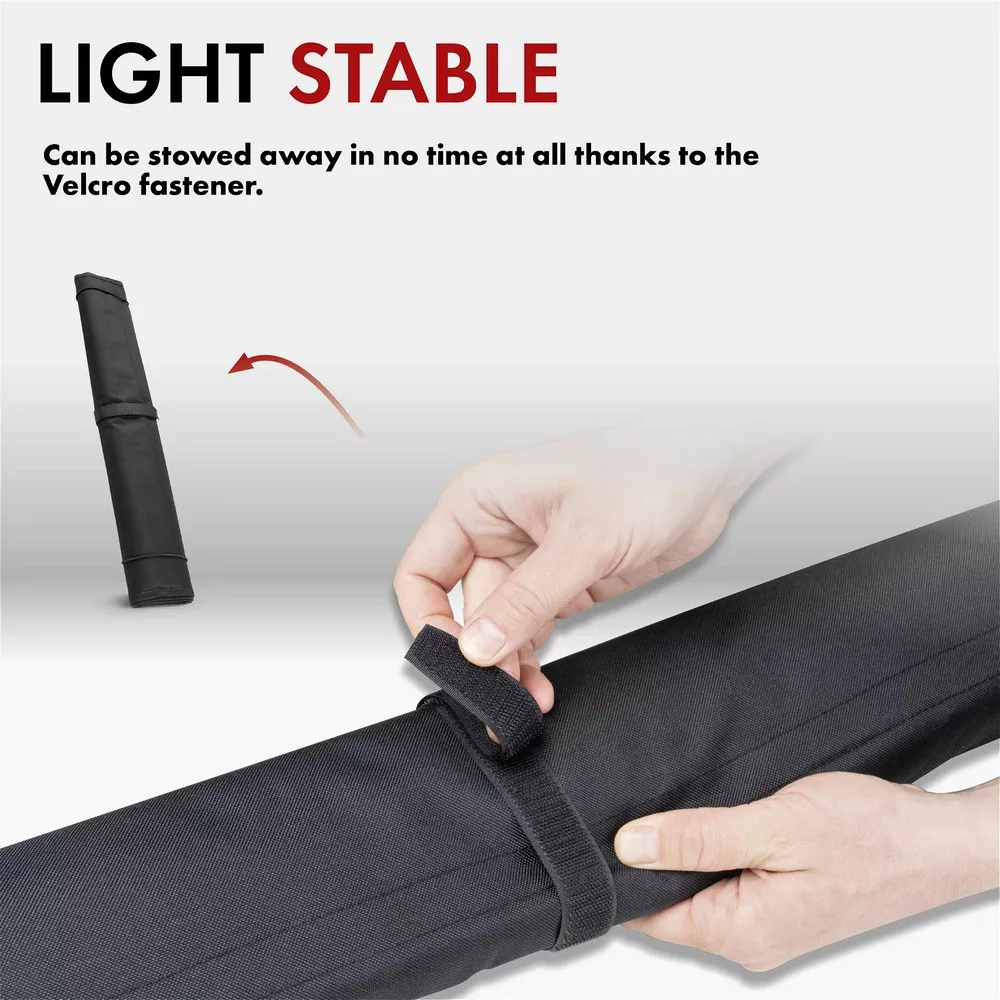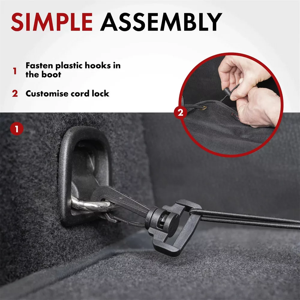 Robosztus és strapabíró poliészterből készül. Az egyik oldalon praktikus műanyag kampók segítik a terméket a csomagtartóban rögzíteni, hogy jól tartsa a be- és kirakodása során. Ha nem lenne szüksége a termékre, a helytakarékosság érdekében összehajtható, és az integrált rugalmas szalagokkal, valamint a tépőzárral tartja össze.