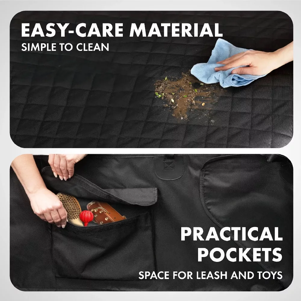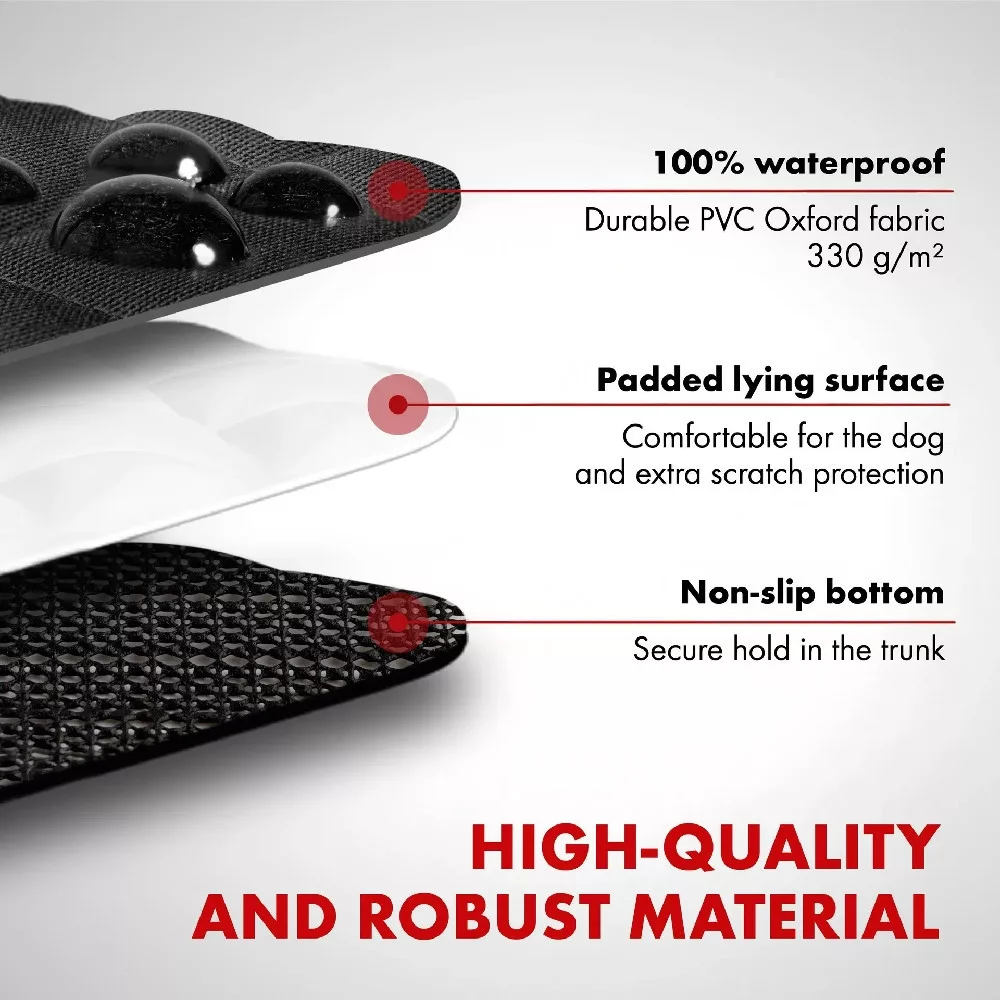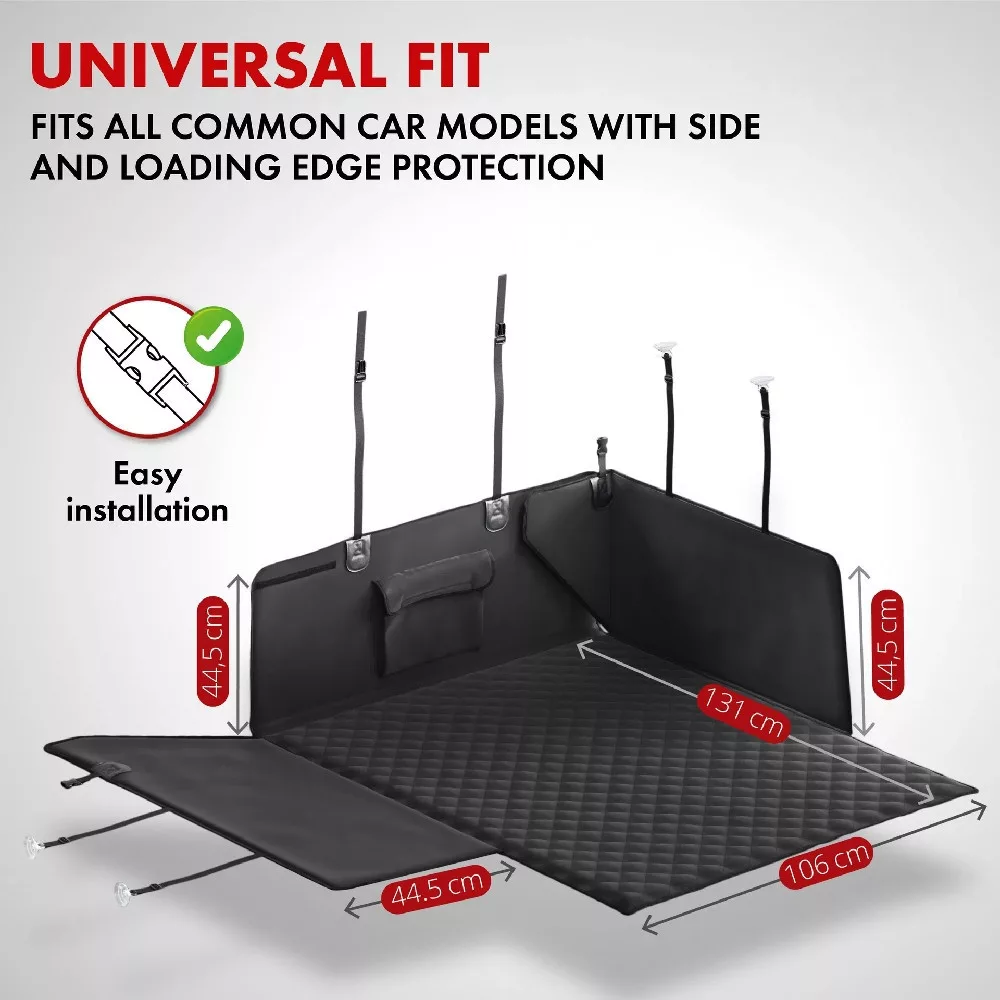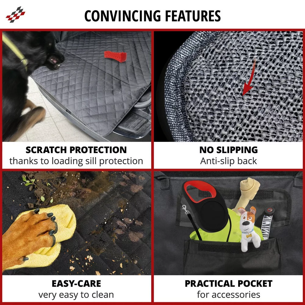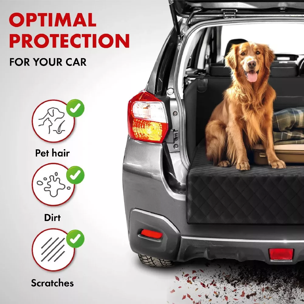 A Bello robusztus és vízlepergető anyagból készült, párnázott fekvőfelülete pedig kiváló minőségű foltvarrással. A burkolatba beépített élvédő van beépítve, amely kihajtva megakadályozza, hogy a lökhárító megkarcolódjon, amikor a kutyája beugrik vagy tárgyakat rak be. A hátulján praktikus zseb található, amely további tárolóhelyet biztosít. A termék befedi a teljes csomagtartót, beleértve az oldal- és a hátsó falakat is, és védi a csomagtartót a sártól és a nedvességtől.