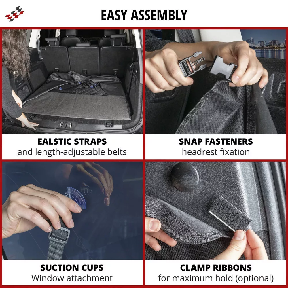 A Bello védőtakaró csúszásgátló alsó oldala biztosítja, hogy jól helyezkedjen el a csomagtartóban. Az oldalsó részek tapadókorongokkal ellátott, állítható, rugalmas hevederekkel vannak a hátsó ablakokhoz rögzítve. A huzat állítható hevederekkel és patentos rögzítőkkel van a hátsó ülésre rögzítve. A Bello tépőzárral átfedő részei rugalmasan illeszkednek autója hátsó sarkaiba. A termék kíméletes ápolásához és tisztításához javasoljuk, hogy nedves ruhával tisztítsa meg.