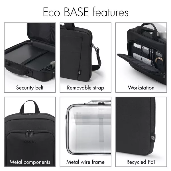 The compact Eco Multi BASE case offers ideal protection for your laptop thanks to its padded notebook compartment. The case fully protects devices between 14 and 15.6" and the elastic strap also secures them within their compartment. The Eco Multi BASE guarantees extra stability and protection with its metal frame, as well as flexible mobility thanks to its lightweight design. Your smartphone or other smaller items like cables, pens or chargers can be stored in the convenient front pocket, so they are always to hand. The case's handles make it comfortable to carry. It can also be carried using its adjustable shoulder strap. The Eco Multi BASE is therefore perfect for you if you always on the go and want to support the recycling of PET bottles with an eco-friendly case.
