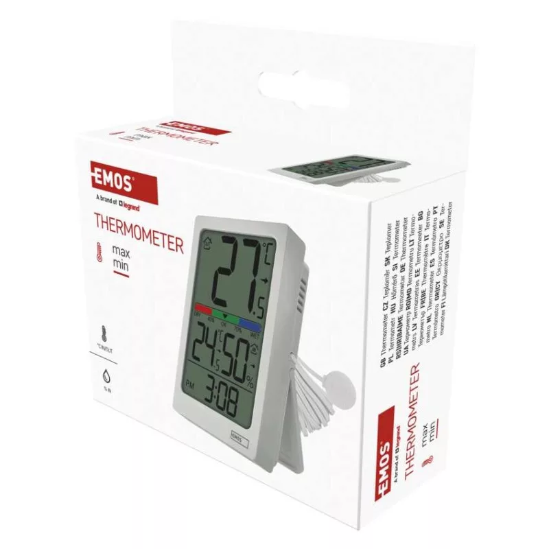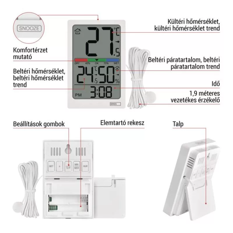 12/24 időformátum: igen|AC (hálózati) adapter: nem|a főegység méretei: 66 × 25 × 100 mm|alkalmazási nyelvek: –|az állomás tápellátása: 2× 1,5 V AAA (nem tartozék)|az érzékelő tápellátása: nem|az idő visszaszámlálása (max.): –|az utolsó érték memóriája: nem|belső hőmérséklet: -10 °C és +50 °C, felbontás 0,1 °C|belső páratartalom: 1 % és 99 % RH, felbontás 1 %|dátum: nem|ébresztőóra: igen|egyéb funkciók: –|értékesítési csomagolás: 1 db, kis doboz|értesítések a mobilalkalmazáshoz: nem|érzékelő méretei: –|falra függesztés lehetősége: igen|folyamatos háttérvilágítás: nem|hangalapú asszisztensek általi vezérlés: nem|hangkommunikáció: nem|hatótávolság szabad területen: –|hőmérő kialakítása: vezetékes|hőmérséklet figyelmeztetés: nem|hőmérséklet index: nem|hőmérséklet tendencia: igen|időzónák: nem|jelátviteli frekvencia: nem|képernyőméret: 53 × 82 mm|kompatibilitás: –|külső hőmérséklet: -50 °C és +70 °C, felbontás 0,1 °C|külső páratartalom: nem|LED háttérvilágítás: nem|lehetséges kiegészítő érzékelő használata: nem|mágnes illesztésre: nem|min. és max. hőmérséklet: igen|naptár: nem|nyomás tendencia: nem|opció a hőmérséklet mértékegység beállítására: °C/°F: °C/°F|órák: igen, quartz|protokoll: –|stopperóra: nem|szerelési anyag: –|színes kijelző (black mask) háttérvilágítású: nem|szundi: igen|támogatott OS: –|vezetékes szonda az érzékelőhöz: 1,9 m, Ø 14 mm