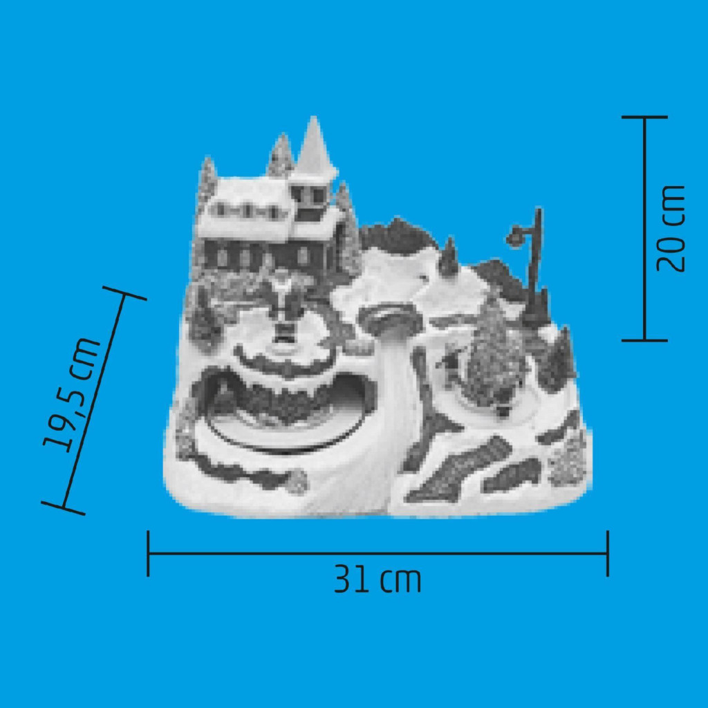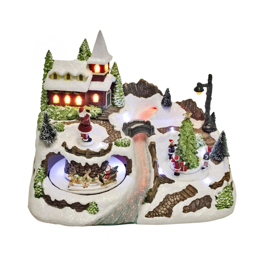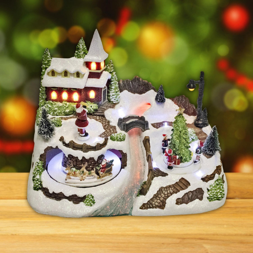 A színes LED fényekkel megvilágított, bájos kis patak melletti falu a templomával, körben járó Mikulással és vidám gyermekekkel együtt teremt varázslatos látványt. A szettben mozgó szán is található, amely még élénkebbé teszi az egész jelenetet.