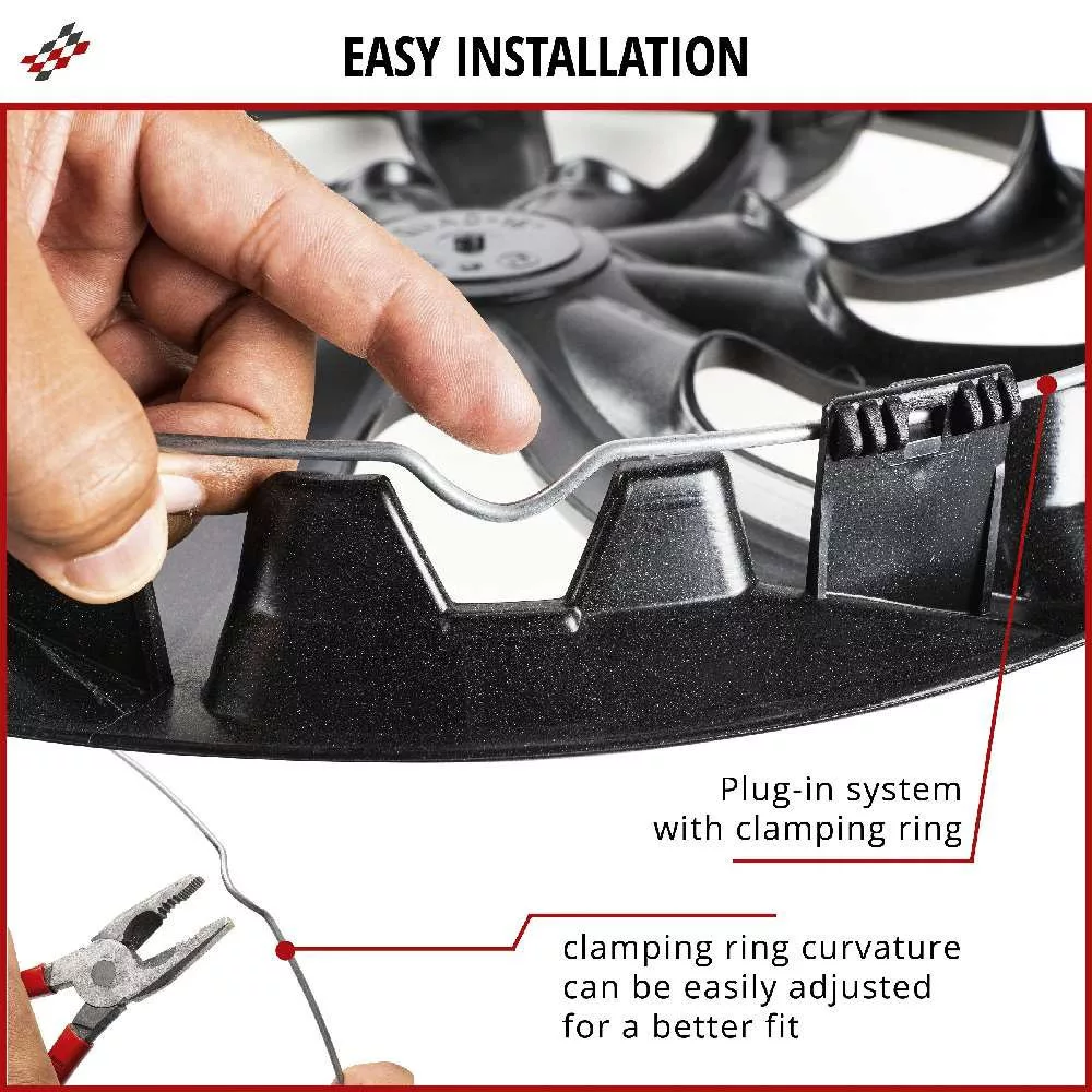Az acélfelnikre gyorsan és egyszerűen felszerelhetők a szorítógyűrűs dugaszolható rendszer segítségével. Győződjön meg arról, hogy a bevágás pontosan a gumiabroncs szelepe fölött van, és helyezze fel a keréktárcsát a felnire. Ha a szorítógyűrű egy kicsit túl széles, könnyen beállíthatja fogóval a még jobb illeszkedés érdekében.