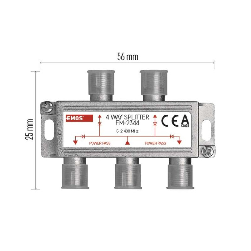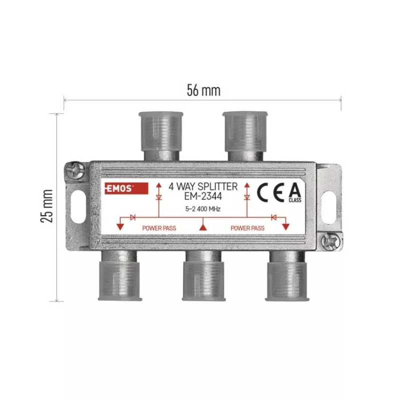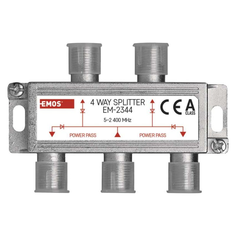 antenna elosztó anyaga: cink öntvény|beiktatási csillapítás: 7,5 dB|bemenetek száma: 1|csatlakozó típusa: F|értékesítési csomagolás: 1 db, doboz|frekvenciatartomány: 5–2 400 MHz|használat: TV + R + SAT|hullámzás a sávban: nincs megadva|kimenetek száma: 4|közvetlen (DC) feszültségen keresztül (power pass): igen, 4×|méretek: 20 × 56 × 25 mm|típus: ferrites|üzemi hőmérséklet: -10–+65 °C|védettség: IP20|visszaverődés csillapítás a bemeneten: nincs megadva