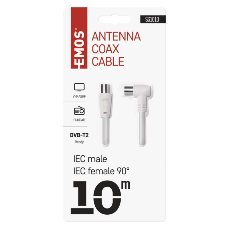 Koaxiális antennakábel IEC csatlakozódugóval és csatlakozóhüvellyel. A kábel 90°-os hajlított csatlakozóval rendelkezik. A kábel kettős árnyékolású az elektromágneses interferencia csökkentése érdekében. 10 m-es kábelhossz.