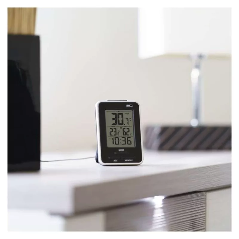 12/24 időformátum: igen|AC (hálózati) adapter: nem|a főegység méretei: 23 × 76 × 107 mm|az állomás tápellátása: 1× 1,5 V AAA (nem tartozék)|az érzékelő tápellátása: nem|az idő visszaszámlálása (max.): nem|az utolsó érték memóriája: nem|belső hőmérséklet: 0 °C és +50 °C, felbontás 0,1 °C|belső páratartalom: 25 % és 95 % RH, felbontás 1 %|dátum: nem|ébresztőóra: igen|értékesítési csomagolás: 1 db, kis doboz|érzékelő méretei: nem|falra függesztés lehetősége: igen|folyamatos háttérvilágítás: nem|hatótávolság szabad területen: nem|hőmérő kialakítása: vezetékes|hőmérséklet figyelmeztetés: nem|hőmérséklet index: nem|hőmérséklet tendencia: nem|időzónák: nem|jelátviteli frekvencia: nem|képernyőméret: 46 × 61 mm|külső hőmérséklet: -40 °C és +60 °C, felbontás 0,1 °C|külső páratartalom: nem|LED háttérvilágítás: nem|lehetséges kiegészítő érzékelő használata: nem|mágnes illesztésre: nem|min. és max. hőmérséklet: igen|naptár: nem|nyomás tendencia: nem|opció a hőmérséklet mértékegység beállítására: °C/°F: °C/°F|órák: igen|stopperóra: nem|színes kijelző (black mask) háttérvilágítású: nem|szundi: igen|vezetékes szonda az érzékelőhöz: 2,9 m, Ø 4 mm
