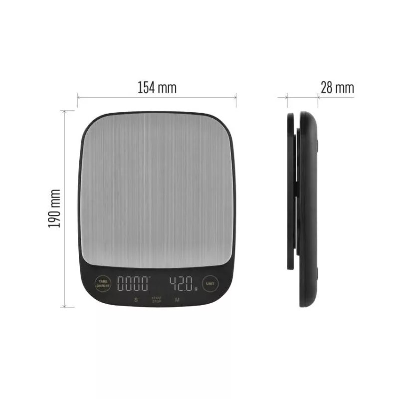 a mérleg felülete: ABS műanyag + rozsdamentes acél|automatikus kikapcsolás: 1 perc után|Bluetooth: nem|BMI – zsír, víz és izom mérése: nem|értékesítési csomagolás: 1 db, kis doboz|háttérvilágítású kijelző: igen|LCD kijelző: igen|lemerülő elem jelzése: igen|max. terhelés: 3 kg|memória: nem|méretek: 154 × 28 × 190 mm|súlymérési pontosság: 0,1 g|súly mértékegységek: g, lb, oz|szín: fekete|táplálás: 3× 1,5 V AAA (tartozék)|termék: konyhai mérleg|túlterhelés jelző: igen|újramérés funkció: igen