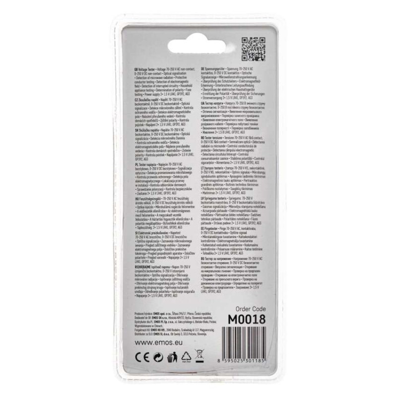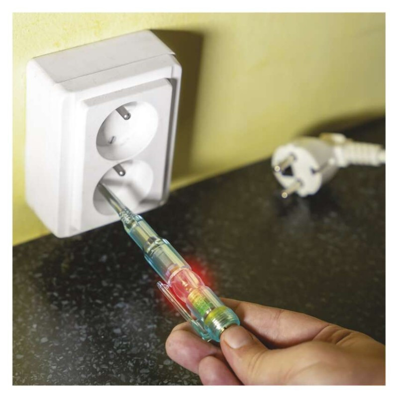 Feszültségmérő fényjelzéssel. Az eszköz 70–250 V-os váltóáram és 0–250 V-os egyenáram mérésére szolgál. A mérőeszköz érzékeli a rövidzárlatot és az áramforrások polaritását is. A mérőeszköz 2 db LR41 akkumulátorral működik (mellékelve).