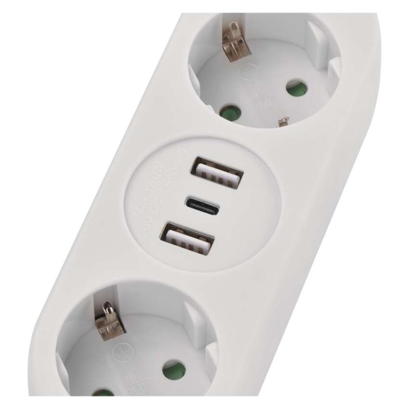 aljzatok száma: 2× 2P + PE SCHUKO|alkalmazási nyelvek: –|az aljzatok és dugók anyaga: műanyag|értékesítési csomagolás: 1 db, akasztható|értesítések a mobilalkalmazáshoz: nem|feszültség/áram: 250 V~/16 A max.|gyerekzár: igen|hangalapú asszisztensek általi vezérlés: nem|hossz: 1,5 m|jelátviteli frekvencia: –|kapcsoló: nem|kompatibilitás: –|max. terhelés: 3 680 W|protokoll: –|szigetelés típusa: PVC|szín: fehér|támogatott OS: –|USB kimenet: 2× USB-A + 1× USB-C ; 5 V DC; total ∑ 3,4 A (17 W) max.|vezeték: H05VV-F3G 1,5 mm²