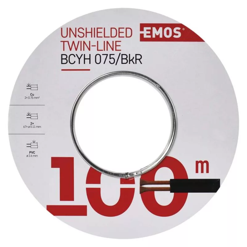 a belső vezeték anyaga: vörösréz (Cu)|a belső vezeték átmérője: 67× 0,12 mm|a belső vezeték szigetelésének színe: nincs|árnyékolás: nem|árnyékoló vezetékek száma: nincs|a vezeték árnyékolásának anyaga: nincs|a vezeték árnyékolásának keresztmetszete: nincs|bevonat anyaga: PVC|csomagolás típusa – hossz: 100 m|értékesítési csomagolás: 100 m, tekercs|garancia-időszak: 2 év|javasolt alkalmazás: alacsony feszültségű átvitel|kettős szigetelés: nem|köpeny színe: fekete, piros és fekete|külső szigetelés: 2× 2,6 mm|maximális üzemi feszültség: 50 V|típus meghatározása: BCYH075BkR|vezeték keresztmetszet: 0,75 mm²