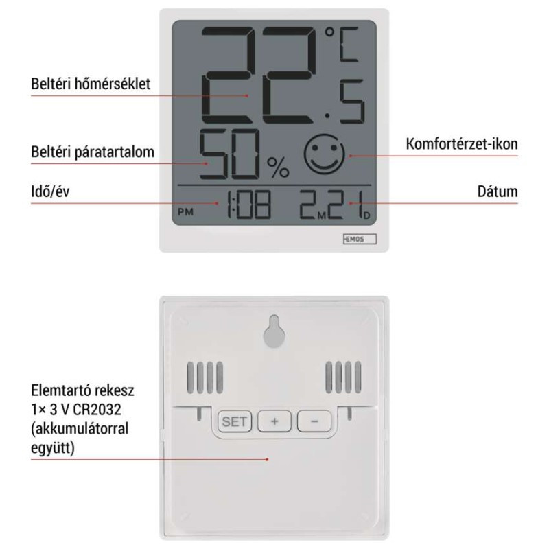 12/24 időformátum: igen|AC (hálózati) adapter: nem|a főegység méretei: 83 × 17 × 88 mm|az állomás tápellátása: 1× 3 V CR2032 (tartozék)|az érzékelő tápellátása: nem|az idő visszaszámlálása (max.): nem|az utolsó érték memóriája: nem|belső hőmérséklet: -10 °C és +50 °C, felbontás 0,1 °C|belső páratartalom: 1 % és 99 % RH, felbontás 1 %|dátum: igen|ébresztőóra: nem|értékesítési csomagolás: 1 db, kis doboz|érzékelő méretei: nem|falra függesztés lehetősége: igen|folyamatos háttérvilágítás: nem|hatótávolság szabad területen: nem|hőmérő kialakítása: vezeték nélküli|hőmérséklet figyelmeztetés: nem|hőmérséklet index: nem|hőmérséklet tendencia: nem|időzónák: nem|jelátviteli frekvencia: nem|képernyőméret: 73 × 73 mm|külső hőmérséklet: nem|külső páratartalom: nem|LED háttérvilágítás: nem|lehetséges kiegészítő érzékelő használata: nem|mágnes illesztésre: nem|min. és max. hőmérséklet: nem|naptár: nem|nyomás tendencia: nem|opció a hőmérséklet mértékegység beállítására: °C/°F: igen|órák: igen, quartz|stopperóra: nem|színes kijelző (black mask) háttérvilágítású: nem|szundi: nem|vezetékes szonda az érzékelőhöz: nem