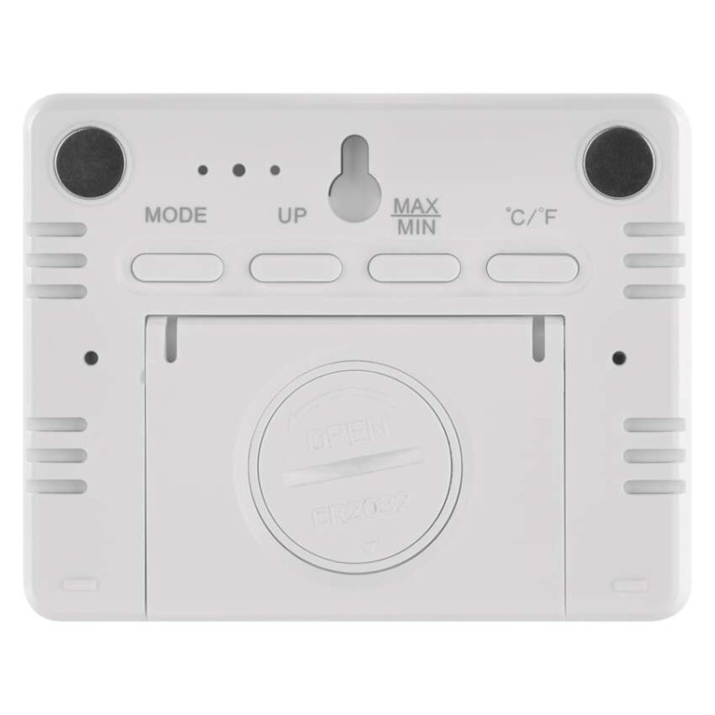 12/24 időformátum: igen|AC (hálózati) adapter: nem|a főegység méretei: 93 × 15 × 73 mm|az állomás tápellátása: 1× 3 V CR2032 (tartozék)|az érzékelő tápellátása: nem|az idő visszaszámlálása (max.): nem|az utolsó érték memóriája: nem|belső hőmérséklet: 0 °C és +50 °C, felbontás 0,1 °C|belső páratartalom: 10 % és 99 % RH, felbontás 1 %|dátum: igen|ébresztőóra: igen|értékesítési csomagolás: 1 db, kis doboz|érzékelő méretei: nem|falra függesztés lehetősége: igen|folyamatos háttérvilágítás: nem|hatótávolság szabad területen: nem|hőmérő kialakítása: vezeték nélküli|hőmérséklet figyelmeztetés: nem|hőmérséklet index: nem|hőmérséklet tendencia: nem|időzónák: nem|jelátviteli frekvencia: nem|képernyőméret: 61 × 82 mm|külső hőmérséklet: nem|külső páratartalom: nem|LED háttérvilágítás: nem|lehetséges kiegészítő érzékelő használata: nem|mágnes illesztésre: igen|min. és max. hőmérséklet: igen|naptár: nem|nyomás tendencia: nem|opció a hőmérséklet mértékegység beállítására: °C/°F: igen|órák: igen, quartz|stopperóra: nem|színes kijelző (black mask) háttérvilágítású: nem|szundi: nem|vezetékes szonda az érzékelőhöz: nem