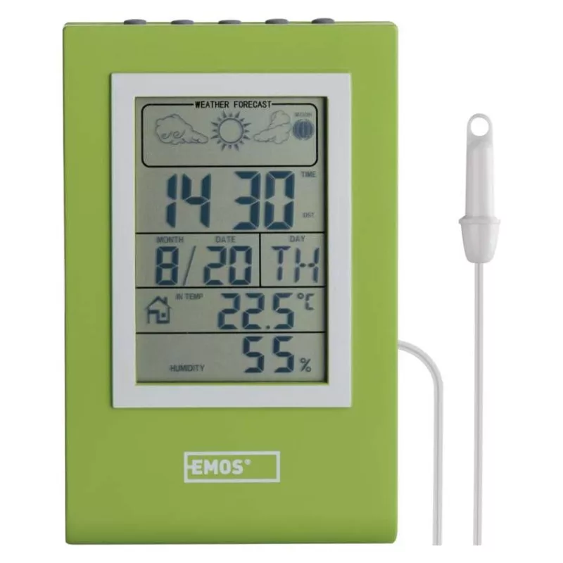 12/24 időformátum: igen|AC (hálózati) adapter: nem|a főegység méretei: 16 × 70 × 109 mm|az állomás tápellátása: 2× LR1130 (tartozék)|az érzékelő hatótávolsága: nem|az érzékelő tápellátása: nem|barométer: nem|belső hőmérséklet: -10 °C és +50 °C, felbontás 0,1 °C|belső páratartalom: 20 % és 95 % RH, felbontás 1 %|csapadékmérő: nem|dátum: igen|ébresztőóra: igen|elektronikus felületi háttérvilágítás: nem|értékesítési csomagolás: 1 db, kis doboz|érzékelő méretei: nem|falra függesztés lehetősége: nem|folyamatos háttérvilágítás: nem|holdfázisok: igen|hőmérő típusa: vezetékes|hőmérséklet figyelmeztetés: nem|hőmérséklet tendencia: nem|időjárás-előrejelzés: igen|időzónák: nem|jelátviteli frekvencia: nem|képernyőméret: 45 × 79 mm|kivetítés: nem|külső hőmérséklet: -50 °C és +70 °C, felbontás 0,1 °C|külső páratartalom: nem|LED háttérvilágítás: nem|lehetséges kiegészítő érzékelő használata: nem|min. és max. hőmérséklet: igen|naptár: igen|nyomás tendencia: nem|opció a hőmérséklet mértékegység beállítására: °C/°F: °C/°F|órák: igen, quartz|szélsebességmérő: nem|színes kijelző (black mask) háttérvilágítású: nem|szundi: igen|tengerszint feletti magasság beállítása: nem|termék: meteorológiai állomás|vezetékes szonda az érzékelőhöz: 1,9 m