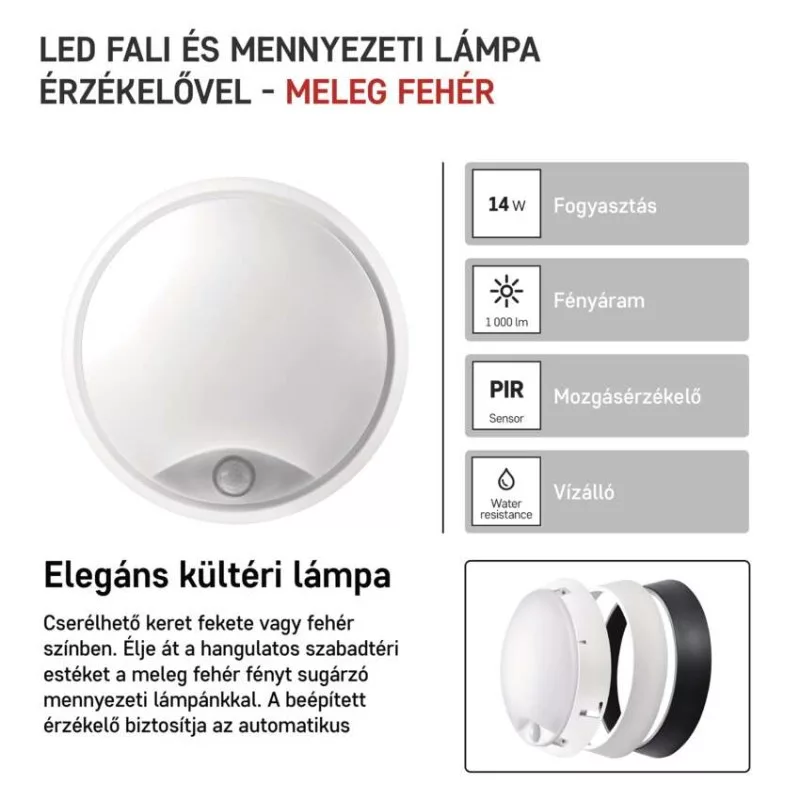 a diffúzor anyaga: műanyag (PC)|a folyosóra és a lépcsőn: igen|a fürdőszobába: igen|a kertre és az erkélyre: igen|a műhelybe és a garázsba: igen|a nappaliba, a hálószobába és a gyerekszobába: nem|áramerősség: 120 mA|áramforrás kimeneti áramerősség: nincs megadva|be a konyhába: nem|diffúzor típusa: tejfehér|élettartam: 25 000 óra|elhelyezés: fali|értékesítési csomagolás: 1 db, doboz|érzékelő hatótávolsága: 10 m|fényáram: 1 000 lm|fényforrás: LED|fényhasznosítás: 71 lm/W|fény színe: meleg fehér|feszültség: 220–240 V|flicker-free: igen|fogyasztás: 14 W|forma: kör|frekvencia: 50/60 Hz|garancia-időszak: 2 év|helyettesítő: 75 W|hivatalba: nem|kategória: CLASSIC|keret színe: fekete/fehér|lámpatest: műanyag (PC)|lámpatest típus: klasszikus lámpatest|LGP anyag: nincs megadva|méretek: 215 × 80 mm átmérővel|mozgásérzékelő: PIR|összeszerelés módja: csatolt|rögzítő nyílás: nincs megadva|sorozat: ZURI|sugárzási szög: 120°|színhőmérséklet: 3 000 K|színvisszaadási index (CRI): Ra > 80|távvezérlő: nem|teljesítménytényező: > 0,5|tompító funkció: nem|UGR<: nincs megadva|védettség: IP54