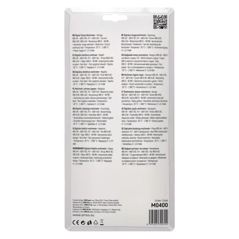 AC áram: 400 A|AC feszültség: 4–600 V|a leolvasott értékek rögzítése: igen|a max. érték rögzítése: nem|automatikus kikapcsolás: igen|DC áram: 400 A|DC feszültség: 400 mV – 600 V|dióda tesztelése: igen|elektromos ellenállás: 400 Ohm – 40 MOhm|elem tesztelése: nem|érintési AC feszültség érzékelés: nem|érintés nélküli AC feszültség érzékelés: nem|értékesítési csomagolás: 1 db, bliszter|háttérvilágítás: nem|hőmérsékletmérés: -20 °C és +1 000 °C|kijelző megjelenítése: 3 3/4 digit|lakatfogó multiméter: igen|lemerülő elem jelzése: igen|méretek: 38 × 71 × 194 mm|táplálás: 2× 1,5 V AAA (tartozék)|tartomány kiválasztása: automatikus|tartozék: akkumulátor, kézikönyv, mérőcsúcsok|tranzisztor tesztelése: nem|vezeték folytonossága: igen