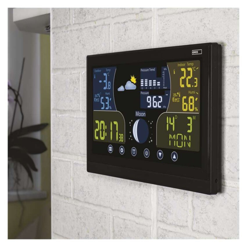 12/24 időformátum: igen|AC (hálózati) adapter: igen, 5 V DC/300 mA (tartozék)|a főegység méretei: 17 × 192 × 127 mm|az állomás tápellátása: 3× 1,5 V AAA (nem tartozék)|az érzékelő hatótávolsága: akár 100 m|az érzékelő tápellátása: 2× 1,5 V AAA (nem tartozék)|barométer: igen|belső hőmérséklet: -10 °C és +50 °C, felbontás 0,1 °C|belső páratartalom: 1 % a 99 % RV, felbontás 1 %|csapadékmérő: nem|dátum: igen|ébresztőóra: igen, 2×|elektronikus felületi háttérvilágítás: igen|értékesítési csomagolás: 1 db, kis doboz|érzékelő méretei: 15 × 62 × 100 mm|falra függesztés lehetősége: igen|folyamatos háttérvilágítás: igen|holdfázisok: igen|hőmérő típusa: vezeték nélküli|hőmérséklet figyelmeztetés: igen|hőmérséklet tendencia: igen|időjárás-előrejelzés: igen|időzónák: igen|jelátviteli frekvencia: 433 MHz|képernyőméret: 168 × 93 mm|kivetítés: nem|külső hőmérséklet: -50 °C és +70 °C, felbontás 0,1 °C|külső páratartalom: 1 % a 99 % RV, felbontás 1 %|LED háttérvilágítás: igen|lehetséges kiegészítő érzékelő használata: 3 (E06018)|min. és max. hőmérséklet: igen|naptár: igen|nyomás tendencia: igen|opció a hőmérséklet mértékegység beállítására: °C/°F: °C/°F|órák: DCF (rádióvezérelt óra)|szélsebességmérő: nem|színes kijelző (black mask) háttérvilágítású: igen|szundi: igen|tengerszint feletti magasság beállítása: igen|termék: meteorológiai állomás|vezetékes szonda az érzékelőhöz: nem