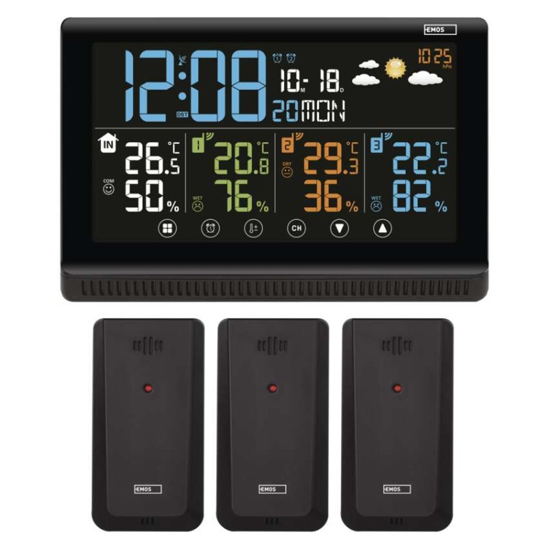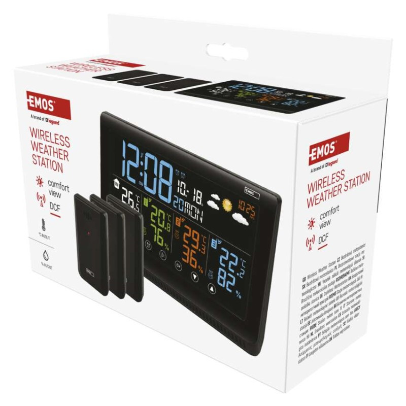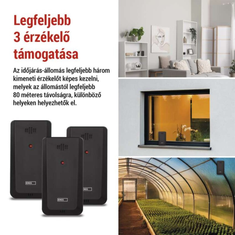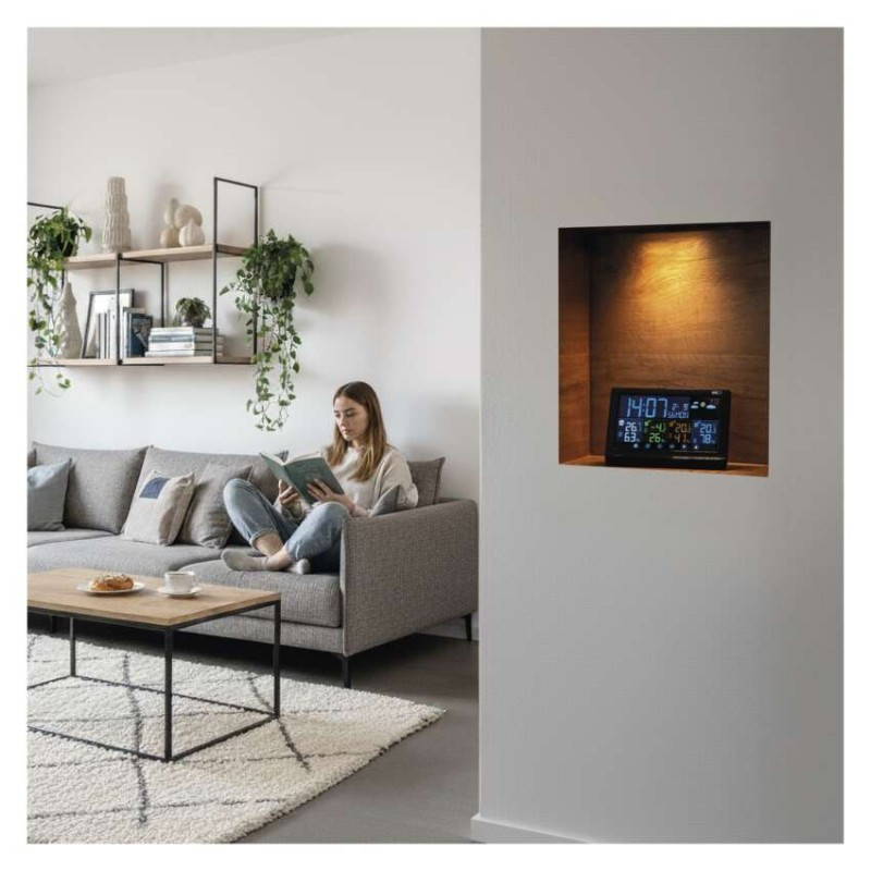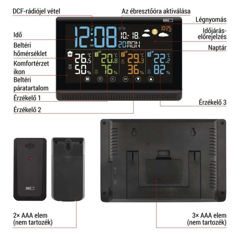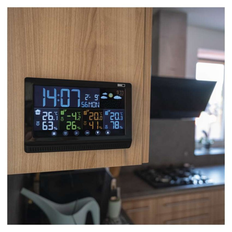 12/24 időformátum: igen|AC (hálózati) adapter: igen, 5 V DC/1 000 mA (tartozék)|a főegység méretei: 198 × 30 × 132 mm|az állomás tápellátása: 3× 1,5 V AAA (nem tartozék)|az érzékelő hatótávolsága: akár 80 m|az érzékelő tápellátása: 2× 1,5 V AAA (nem tartozék)|barométer: igen|belső hőmérséklet: -10 °C és +50 °C, felbontás 0,1 °C|belső páratartalom: 20 % és 95 % RH, felbontás 1 %|csapadékmérő: nem|dátum: igen|ébresztőóra: igen, 2×|egyéb funkciók: USB-A kimenet|elektronikus felületi háttérvilágítás: igen|értékesítési csomagolás: 1 db, kis doboz|értesítések a mobilalkalmazáshoz: #|érzékelő méretei: 50 × 25 × 95 mm|falra függesztés lehetősége: igen|folyamatos háttérvilágítás: igen|hangalapú asszisztensek általi vezérlés: #|holdfázisok: nem|hőmérő típusa: vezeték nélküli|hőmérséklet figyelmeztetés: nem|hőmérséklet tendencia: nem|időjárás-előrejelzés: igen|időzónák: igen|jelátviteli frekvencia: 433 MHz|képernyőméret: 169 × 93 mm|kivetítés: nem|kompatibilitás: #|külső hőmérséklet: -40 °C és +70 °C, felbontás 0,1 °C|külső páratartalom: 20 % és 95 % RH, felbontás 1 %|LED háttérvilágítás: igen|lehetséges kiegészítő érzékelő használata: 3 (E00387, E05018)|min. és max. hőmérséklet: igen|naptár: igen|nyomás tendencia: igen|opció a hőmérséklet mértékegység beállítására: °C/°F: °C/°F|órák: DCF (rádióvezérelt óra)|protokoll: #|szélsebességmérő: nem|színes kijelző (black mask) háttérvilágítású: igen|szundi: igen|támogatott OS: #|tengerszint feletti magasság beállítása: nem|termék: meteorológiai állomás|vezetékes szonda az érzékelőhöz: nem