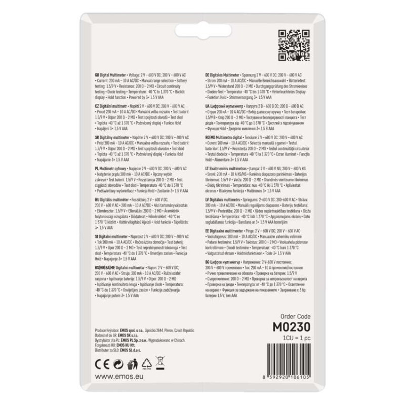AC áram: 200 mA – 10 A|AC feszültség: 200–600 V|a leolvasott értékek rögzítése: igen|a max. érték rögzítése: nem|automatikus kikapcsolás: igen|DC áram: 200 mA – 10 A|DC feszültség: 2–600 V|dióda tesztelése: igen|elektromos ellenállás: 200 Ohm – 2 MOhm|elem tesztelése: 1,5 V/9 V|érintési AC feszültség érzékelés: nem|érintés nélküli AC feszültség érzékelés: nem|értékesítési csomagolás: 1 db, bliszter|háttérvilágítás: igen|hőmérsékletmérés: -40 °C až +300 °C|kijelző megjelenítése: 3,5 digit|lakatfogó multiméter: nem|lemerülő elem jelzése: igen|méretek: 35 × 75 × 155 mm|táplálás: 3× 1,5 V AAA (tartozék)|tartomány kiválasztása: manuális|tartozék: akkumulátor, kézikönyv, mérőcsúcsok, hőmérséklet szonda|tranzisztor tesztelése: nem|vezeték folytonossága: igen