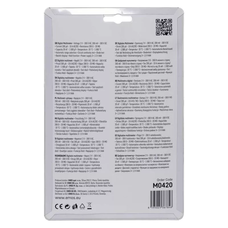 AC áram: 200 µA – 10 A / fogóval, 1 000 A-ig (nem tartozék)|AC feszültség: 2–300 V|a leolvasott értékek rögzítése: igen|a max. érték rögzítése: igen|automatikus kikapcsolás: igen|DC áram: 200 µA – 10 A / fogóval, 1 000 A-ig (nem tartozék)|DC feszültség: 200 mV – 300 V|dióda tesztelése: igen|elektromos ellenállás: 200 Ohm – 20 MOhm|elem tesztelése: nem|érintési AC feszültség érzékelés: nem|érintés nélküli AC feszültség érzékelés: nem|értékesítési csomagolás: 1 db, bliszter|háttérvilágítás: igen|hőmérsékletmérés: -20 °C és +1 000 °C|kijelző megjelenítése: 3,5 digit|lakatfogó multiméter: nem|lemerülő elem jelzése: igen|méretek: 35 × 75 × 158 mm|táplálás: 3× 1,5 V AAA (tartozék)|tartomány kiválasztása: automatikus|tartozék: akkumulátor, útmutató, mérőkábelek, szűkítő tranzisztorok méréséhez, K típusú hőmérő szonda, akkumulátorfedél zár|tranzisztor tesztelése: igen|vezeték folytonossága: igen