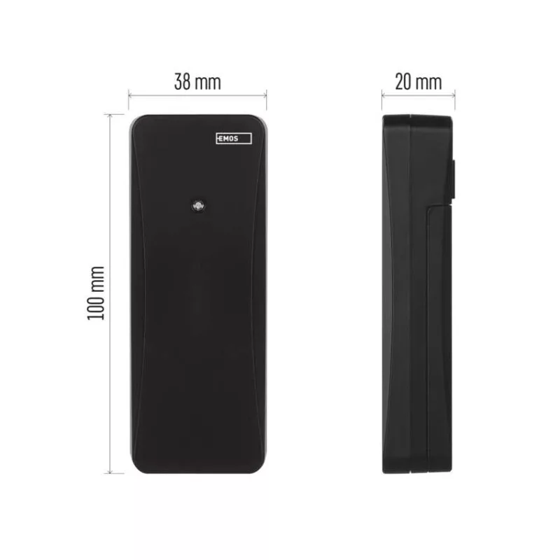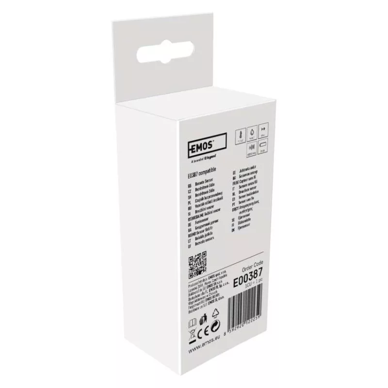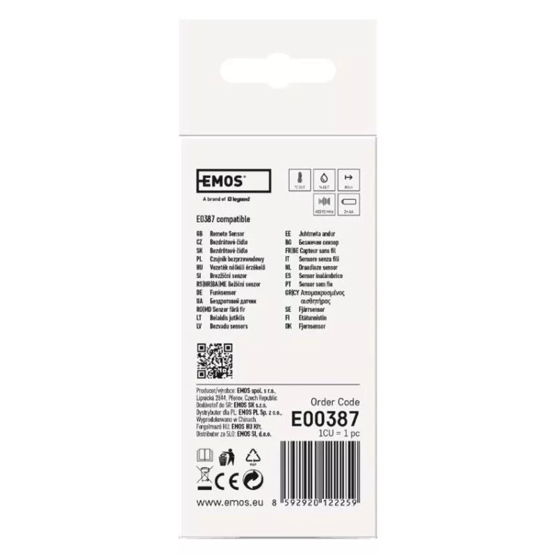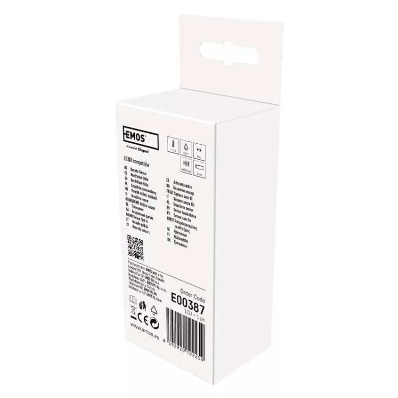 a főegység típusához tervezett: E0387, E8614, E0352, E0316, E0107, E0558W, E8610|értékesítési csomagolás: 1 db, kis doboz|frekvencia: 433 MHz|hatótávolság szabad területen: akár 80 m|külső páratartalom jelző: 1 % és 99 % RH, felbontás 1 %|külső vezetékes érzékelő: nem|méretek: 20 × 38 × 100 mm|táplálás: 2× 1,5 V AA (nem tartozék)|üzemi hőmérséklet: -40 °C és +60 °C, felbontás 0,1 °C