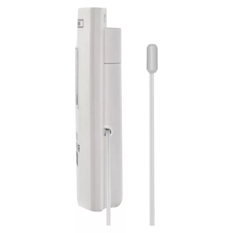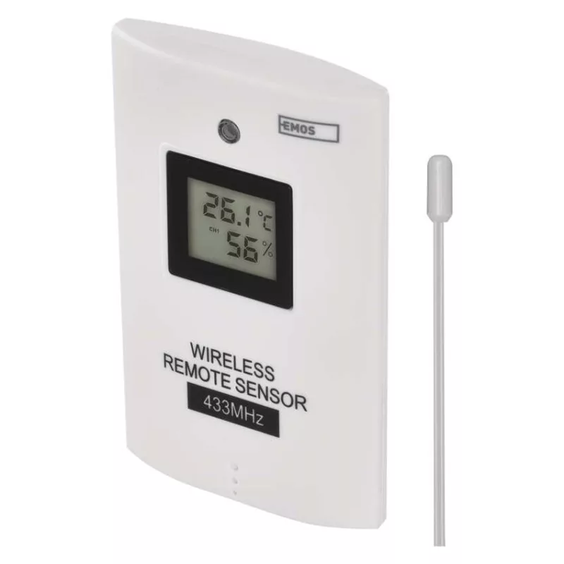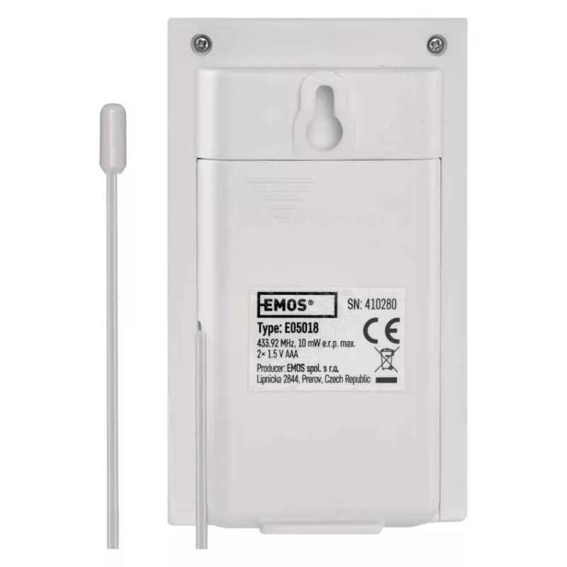 a főegység típusához tervezett: AOK-5018B, AOK-5060, S627BS, IB303TR, E0107T, IW001-DCF, IW003-DCF, E5068, E5062, E5063, E3078, E3028, E0300, E8236, E0211, E3010, E0127, E0329|értékesítési csomagolás: 1 db, kis doboz|frekvencia: 433 MHz|hatótávolság szabad területen: akár 25 m|külső páratartalom jelző: 20 % és 95 % RH, felbontás 1 %|külső vezetékes érzékelő: igen|méretek: 21 × 60 × 100 mm|táplálás: 2× 1,5 V AAA (nem tartozék)|üzemi hőmérséklet: -50 °C és +70 °C, felbontás 0,1 °C