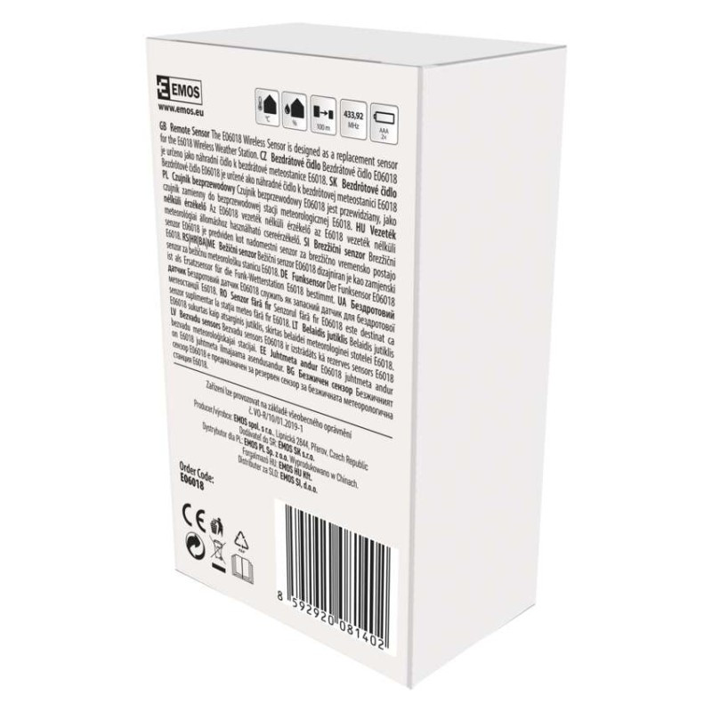 a főegység típusához tervezett: E6018, E6016|értékesítési csomagolás: 1 db, kis doboz|frekvencia: 433 MHz|hatótávolság szabad területen: akár 100 m|külső páratartalom jelző: 1 % és 99 % RH, felbontás 1 %|külső vezetékes érzékelő: nem|méretek: 15 × 62 × 100 mm|táplálás: 2× 1,5 V AAA (nem tartozék)|üzemi hőmérséklet: -50 °C és +70 °C, felbontás 0,1 °C