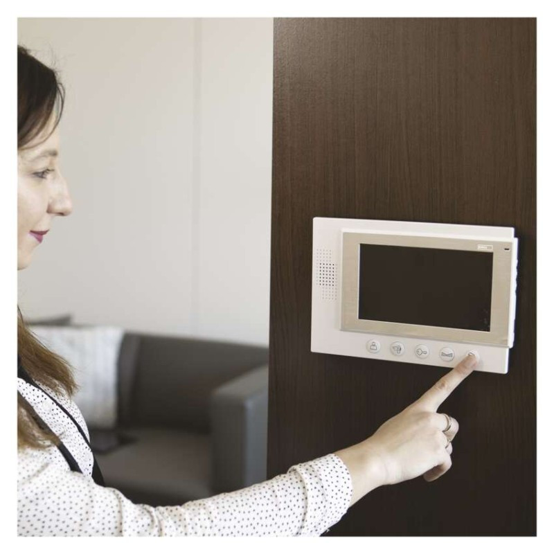 Egyszerű videótelefon-rendszer ajtóhoz. A kép nagy, 7#-es, színes LCD kijelzőn jelenik meg. Az eszköz áramellátásáról 12 V-os adapter gondoskodik. Az eszköz segítségével vezérelhető egy ajtózár és egy csúszókapu.