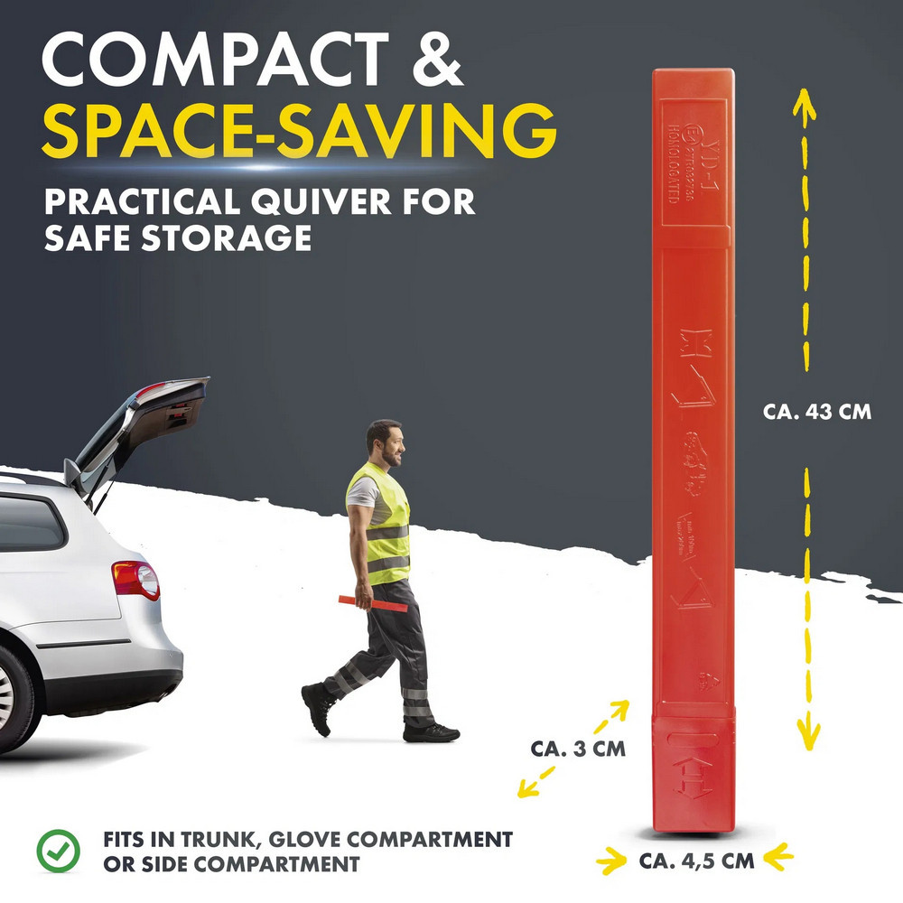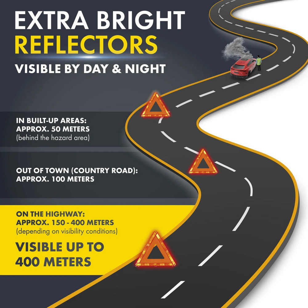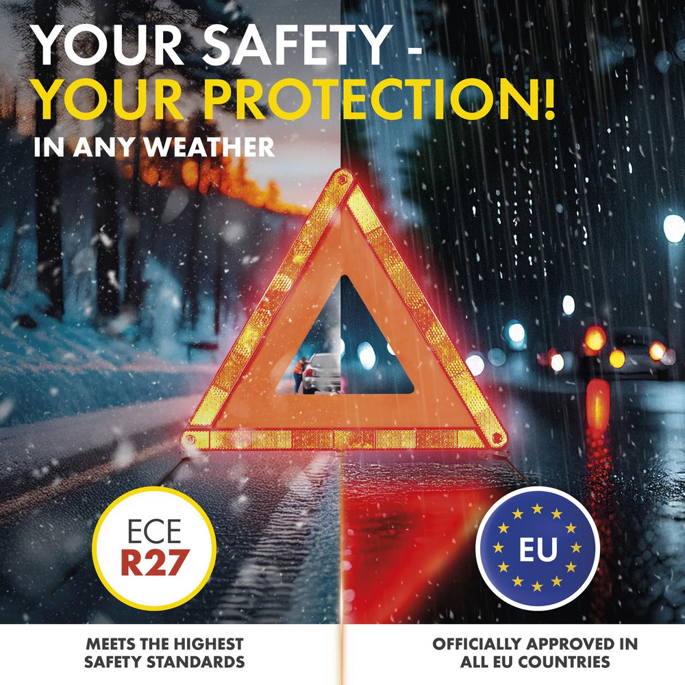 Az elakadásjelző háromszög megfelel az ECE R27 szabványnak. A termék egy kis tegezben összehajtva kerül kiszállításra, így könnyen tárolható. Szükség esetén egyszerűen vedd ki a háromszöget a csomagolásból, és hajtsd ki. A praktikus fémállványok biztonságossá és egyszerűvé teszik a baleset helyszínétől távoli felállítást.