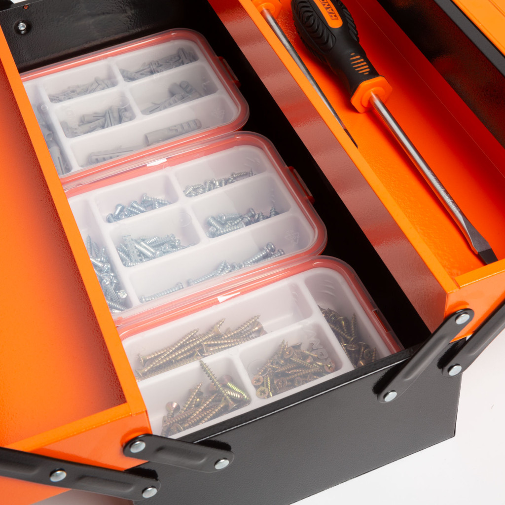 Klasszikus elrendezésű, harmónikaszerűen nyitható szerszámosláda. Strapabíró fémből készült, így ellenáll az intenzív használatnak is. A szerszámokhoz történő könnyű hozzáférést a szélesre nyitható felső rész biztosítja. A különböző eszközök rendezetten tárolhatóak, áttekinthetőek és egyszerűen hozzáférhetőek a 3 szintes elrendezésnek köszönhetően.