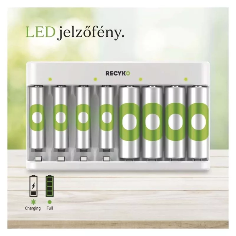 a csomagolt cellák töltési ideje: 9:00|a feltöltött akkumulátorok típusa: NiMH|a feltöltött cellák mérete: AAA, AA|alkáli elemek érzékelése: igen|cellák száma a csomagolásban: 8|cellák típusa a csomagolásban: AA ReCyko 2 100, AAA ReCyko 850|csatlakozó típusa: USB|egyidejűleg töltött akkumulátorok száma: 2,4, 6 vagy 8|értékesítési csomagolás: 1 db, kis papír doboz|fordított polaritás elleni védelem: igen|márka: GP|méretek: 74,3 × 126 × 21 mm|sérült elemek érzékelése: igen|speciális funkciók: nincs megadva|tápkábel (tartozék): micro USB|táplálás: USB 5 V/1 A|töltési áram 9 V: nincs megadva|töltési áram AA: 250 mA|töltési áram AAA: 250 mA|töltési áram C: nincs megadva|töltési áram D: nincs megadva|töltési csatornák száma: 4|töltési idő 9 V 200 mAh: nincs megadva|töltési idő AA 2 700 mAh: 10:00|töltési idő AAA 1 000 mAh: 5:00|töltési idő C 3 500 mAh: nincs megadva|töltési idő D 4 500 mAh: nincs megadva|töltő típusa: okos