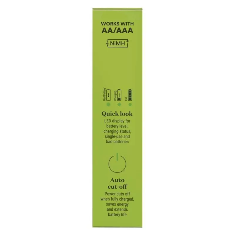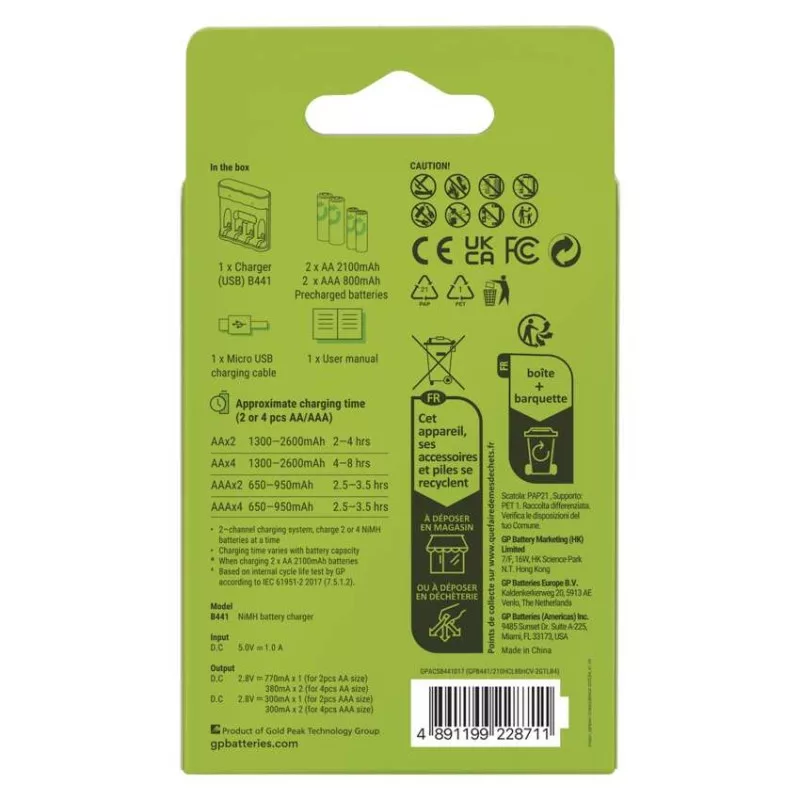 a csomagolt cellák töltési ideje: 2:30 - 7:00|a feltöltött akkumulátorok típusa: NiMH|a feltöltött cellák mérete: AAA, AA|alkáli elemek érzékelése: igen|cellák száma a csomagolásban: 4|cellák típusa a csomagolásban: AA Recharge 2100, AAA Recharge 800|csatlakozó típusa: USB|egyidejűleg töltött akkumulátorok száma: 2 vagy 4|értékesítési csomagolás: 1 db, kis papír doboz|fordított polaritás elleni védelem: igen|márka: GP|méretek: 78 × 68 × 25 mm|sérült elemek érzékelése: igen|speciális funkciók: nincs megadva|tápkábel (tartozék): micro USB|táplálás: USB 5 V/1 A|töltési áram 9 V: nincs megadva|töltési áram AA: 770 mA/380 mA|töltési áram AAA: 300 mA|töltési áram C: nincs megadva|töltési áram D: nincs megadva|töltési csatornák száma: 2|töltési idő 9 V 200 mAh: nincs megadva|töltési idő AA 2 700 mAh: 3:30/7:00|töltési idő AAA 1 000 mAh: 3:30|töltési idő C 3 500 mAh: nincs megadva|töltési idő D 4 500 mAh: nincs megadva|töltő típusa: okos
