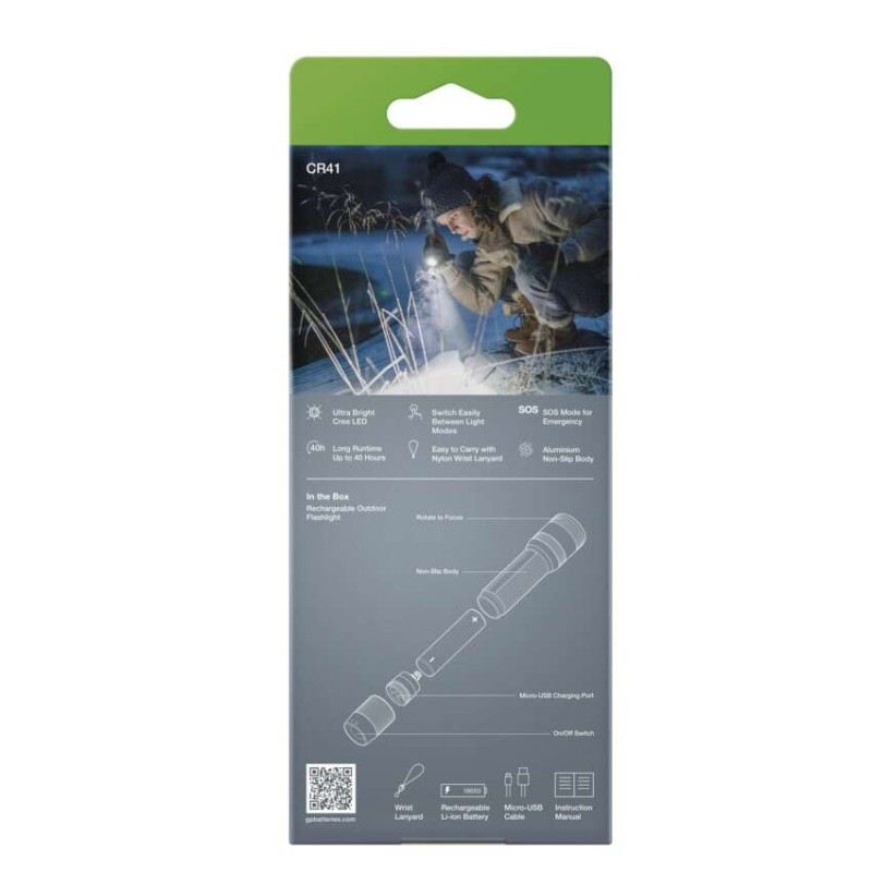 akkumulátor típusa: 18650/3,7 V/2 550 mAh|anyag: alumínium|a töltés LED jelzése: igen|az akkumulátor állapotának LED-es jelzése: nem|elem a csomag része: igen|értékesítési csomagolás: 1 db, kis papír doboz|feltöltési idő: 3 óra|fényáram: 100 % – 650 lm, 35 % – 200 lm, 5 % – 30 lm|fényforrás: CREE SMD LED|fókusz: igen|garancia-időszak: 2 év|jellemzők: textilhurok|márka: GP|maximális fényárama: 650 lm|max. világítási távolság: 135 m|méretek: 33 × 136 mm|speciális funkciók: többfunkciós kapcsoló|súly: 179 g|szín: fekete|táplálás: Li-Ion|tartozékok: USB kábel|tölthető: igen|töltőcsatlakozó típusa: micro USB|ütésállóság: 1 m|üzemidő részletezés: 100 % – 5,5 h, 35 % – 8,5 h, 5 % – 40 h|üzemmódok: 100 %, 35 %, 5 %, SOS|világítási idő: 5,5–40 óra|világítási távolság: nincs megadva|világítási üzemmódok száma: 4|vízálló: IPX7