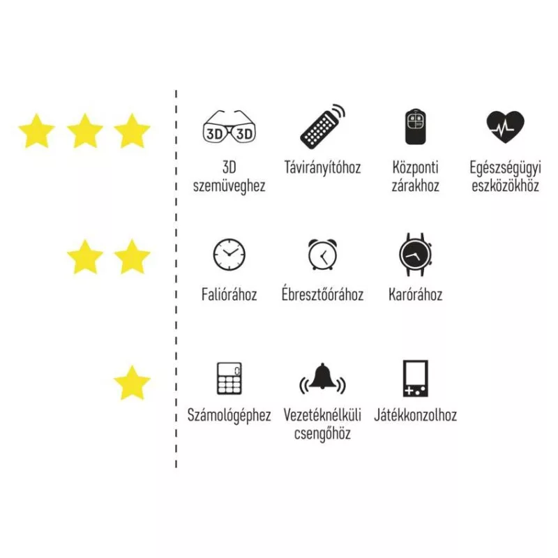 Megfelel az érzékeny eszközökben történő használatra, mint például: karórák, számológépek, biztonsági világítás, gépkocsiriasztók, nyomásmérők, távirányítók és egyebek. Különösen hosszú, akár 10 éves eltarthatósági idő.