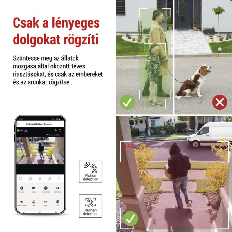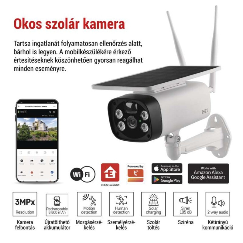 a csomag tartalma: #|a kamera érzékelőelemei: –|alkalmazási nyelvek: EN, CZ, SK, PL, DE, HU, SI, FR, + 60 másik nyelven|állatfelismerés: nem|áthidalási idő: akár 8 hónapig|automatikus képtárolás: igen|az érzékelési terület beállítása: nem|egyéb funkciók: –|éjszakai látásmód: igen|emberi test felismerése: igen|értékesítési csomagolás: 1 db, doboz|értesítések a mobilalkalmazáshoz: igen|felhőalapú tárolás: igen|garancia-időszak: 2 év|hangalapú asszisztensek általi vezérlés: igen|hangérzékelés: nem|hangkommunikáció: kétirányú|hívás kezdeményezése a gomb segítségével: nem|IR CUT: igen|jelátviteli frekvencia: 2,4 GHz WIFI|kamera felbontása: 2 048 × 1 536|kamera látószöge: 110°|kamera tápegység: 4×18650 akkumulátor 2 200 mAh + napelem + DC adapter 5 V/1 A (tartozék)|kompatibilitás: EMOS GoSmart, Tuya, Lidl, Smartlife, nyitott rendszer|lopás elleni védelem: alkalmazás által blokkolva|magasság: 100 mm|maximális éjszakai látótávolság: 10 méter|mélység: 235 mm|motoros forgatás: nem|mozgásérzékelés: igen|mozgásérzékelési szög: 120°|mozgásérzékelési tartomány: 10 m|mozgáskövetés (tracking): nem|ONVIF támogatás: nem|privát üzemmód: nem|protokoll: Wi-Fi + Bluetooth|sorozat: GoSmart|szélesség: 140 mm|szerelés: falra|szerelési anyag: igen|szín: fehér|sziréna: igen|támogatott OS: Android, iOS|tárolás SD-kártyán: igen|tartó típusa: állvány menet|tartozék tápegység: igen|terméktípus: IP kamera|további beltéri monitor: nem|további LED fény: nem|védettség: IP44|WebRTC funkció: igen