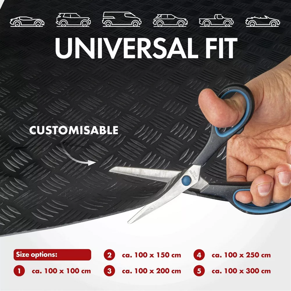 Az univerzális szőnyeg rendkívül strapabíró NBR (nitril-butadién gumi) anyagból készült. Az anyag viszonylag puha, és ollóval vagy vágókéssel könnyen a kívánt formára és méretre vágható. A hátulján csúszásgátló felület került kialakításra. Tartós, könnyen tisztítható. Tökéletesen alkalmas a járműveken kívül pl. rakodótórben, műhelyben, hajón, lalókocsiban, garázsban, háztartásban való felhasználásra is!