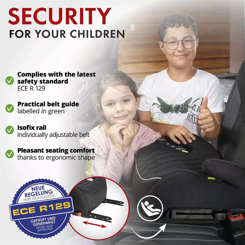 Prémium ISOFIX ülésmagasító, a legújabb ECE R 129 szabvány szerint tesztelve. 125-150 cm közötti testmagassághoz.