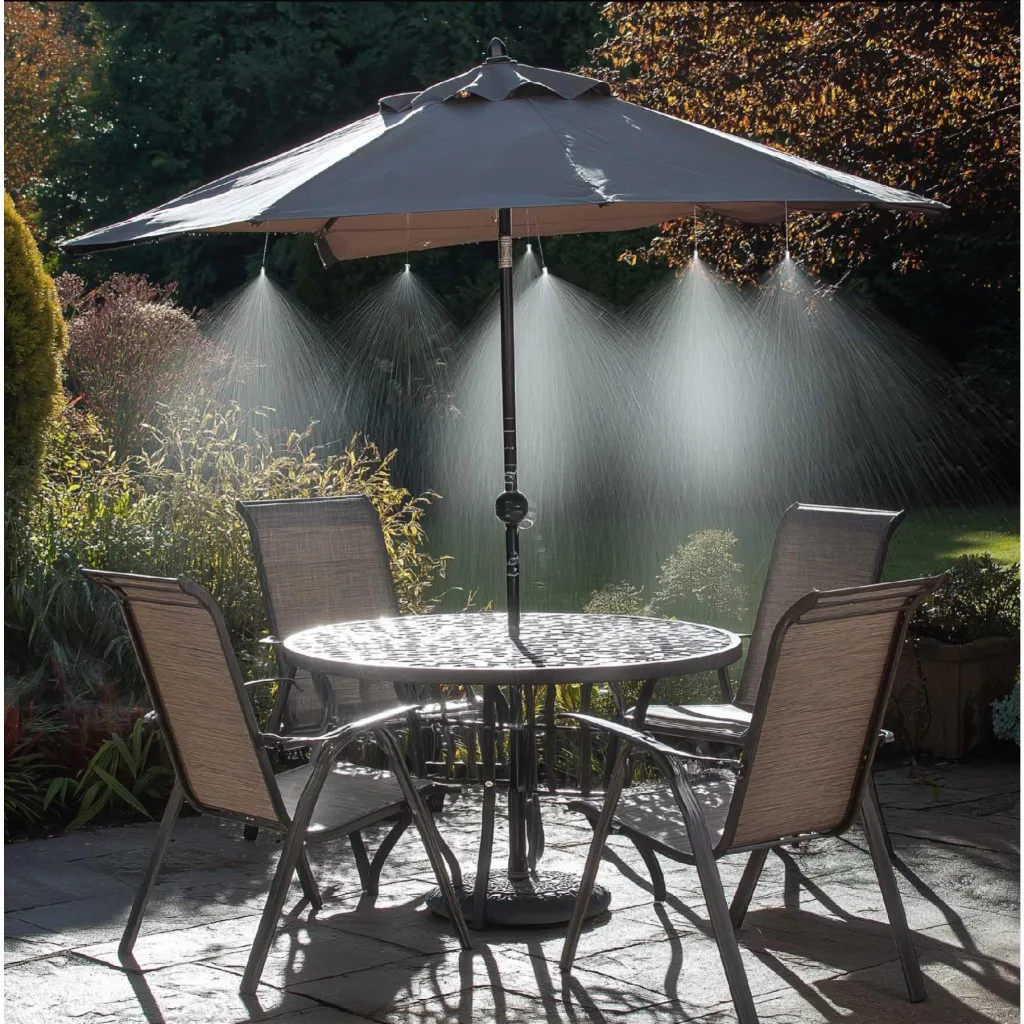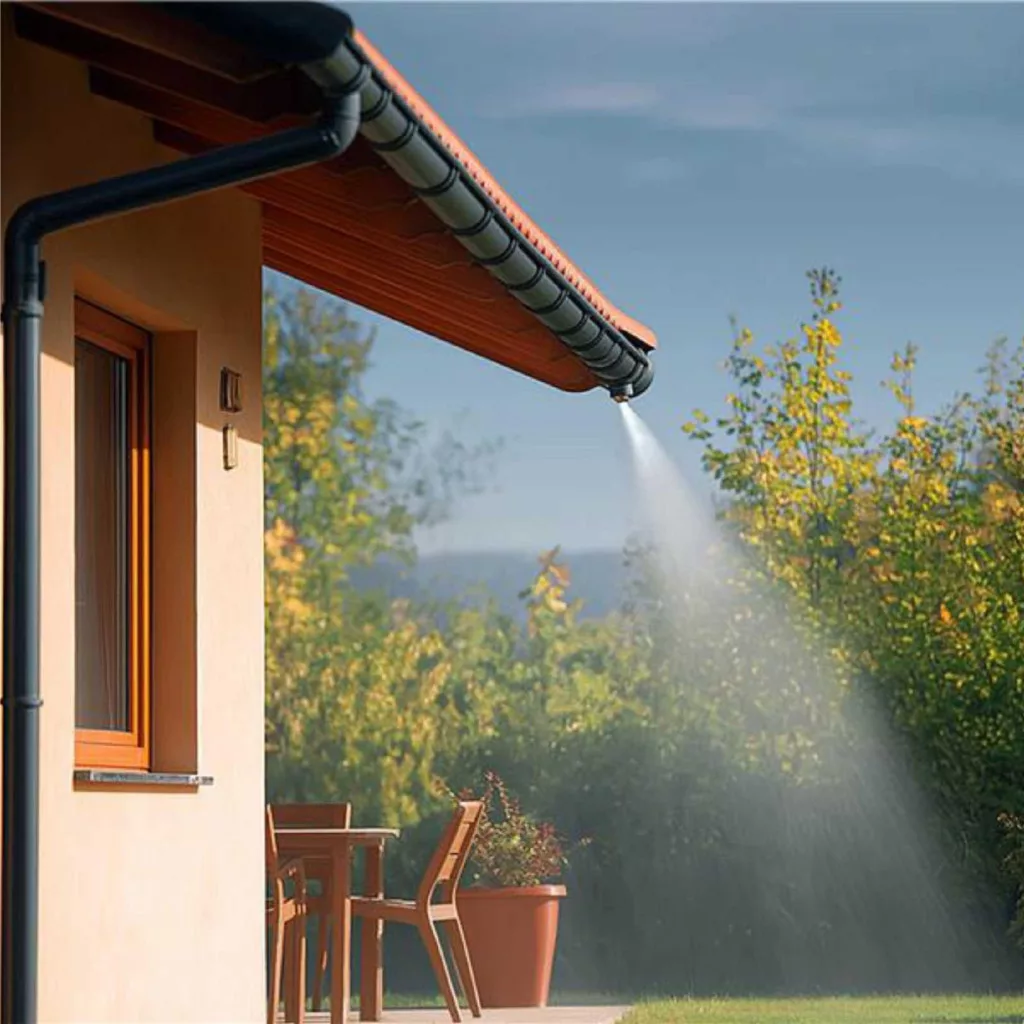 A készlet párakapura, napernyőre vagy ereszre is felszerelhető, így sokféle helyszínen alkalmazható. A szabályozható porlasztás lehetővé teszi, hogy mindig a kívánt intenzitással működjön, legyen szó emberek felfrissítéséről, állatok hűtéséről vagy növények gyengéd öntözéséről. A rendszer UV-sugárzás ellen védett, ezért hosszú távon is megbízható társ a kertben.