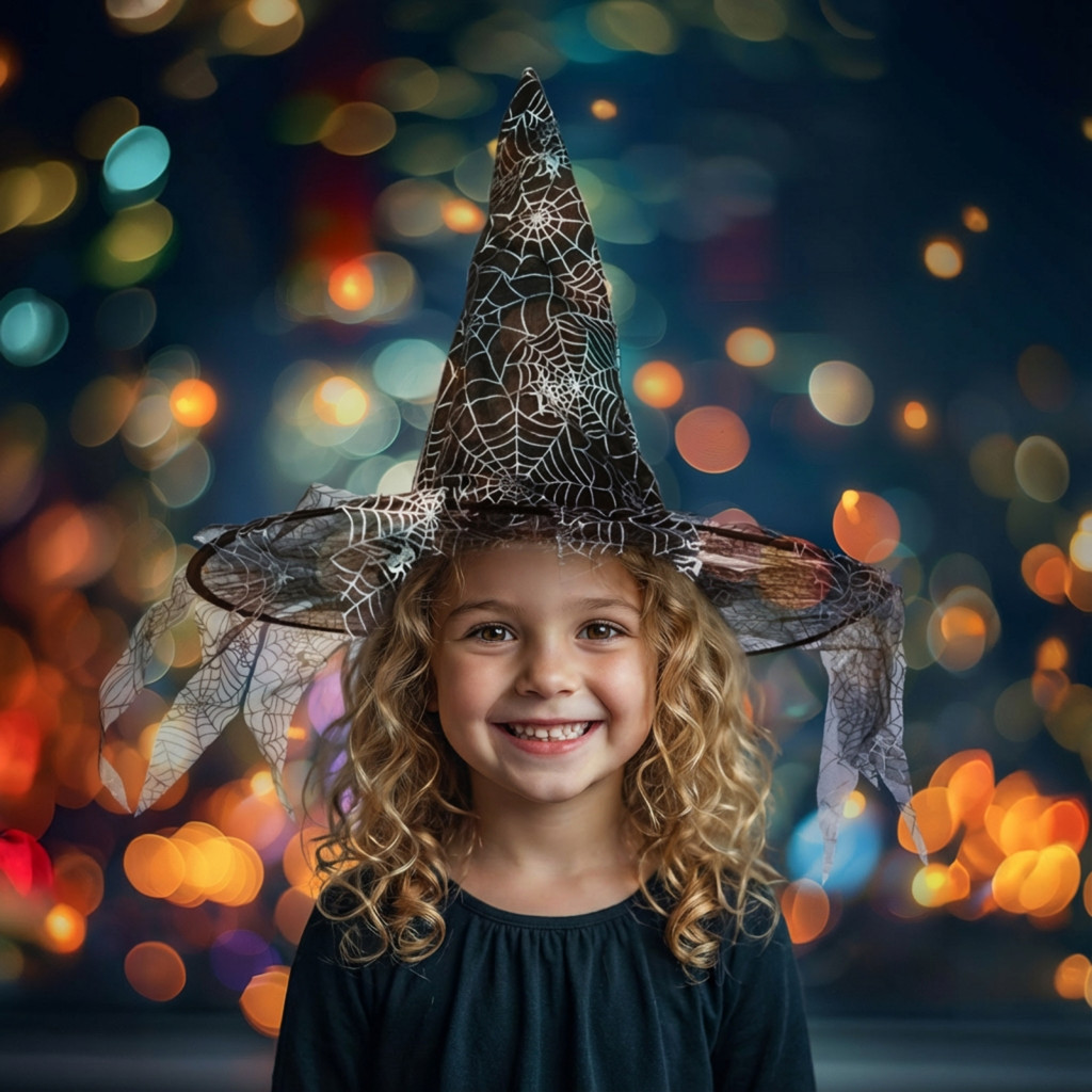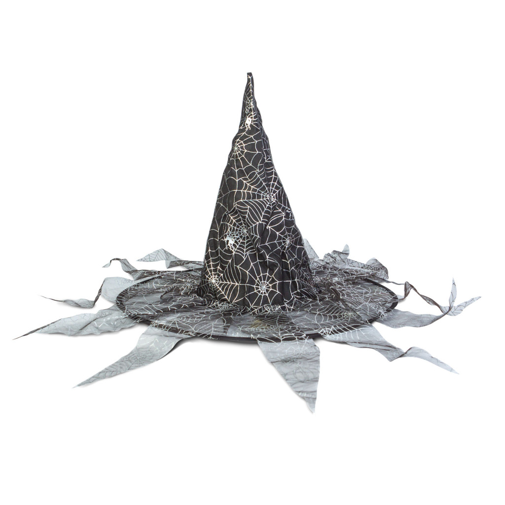 Hegyes, fekete boszorkánykalap, amely kiváló halloween-i jelmez kiegészítő. A kalap külső részén lelógó, fekete, pókhálómintás anyag található.